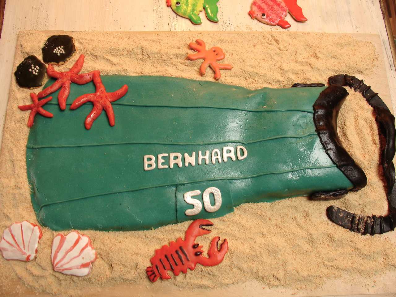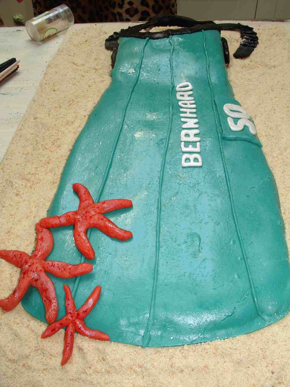I planned to make this cake for his 50th birthday and tint it the same color as his beloved former fins (may they RIP). When he saw it, he was thrilled by my tribute to his former favorite scuba accoutrement.