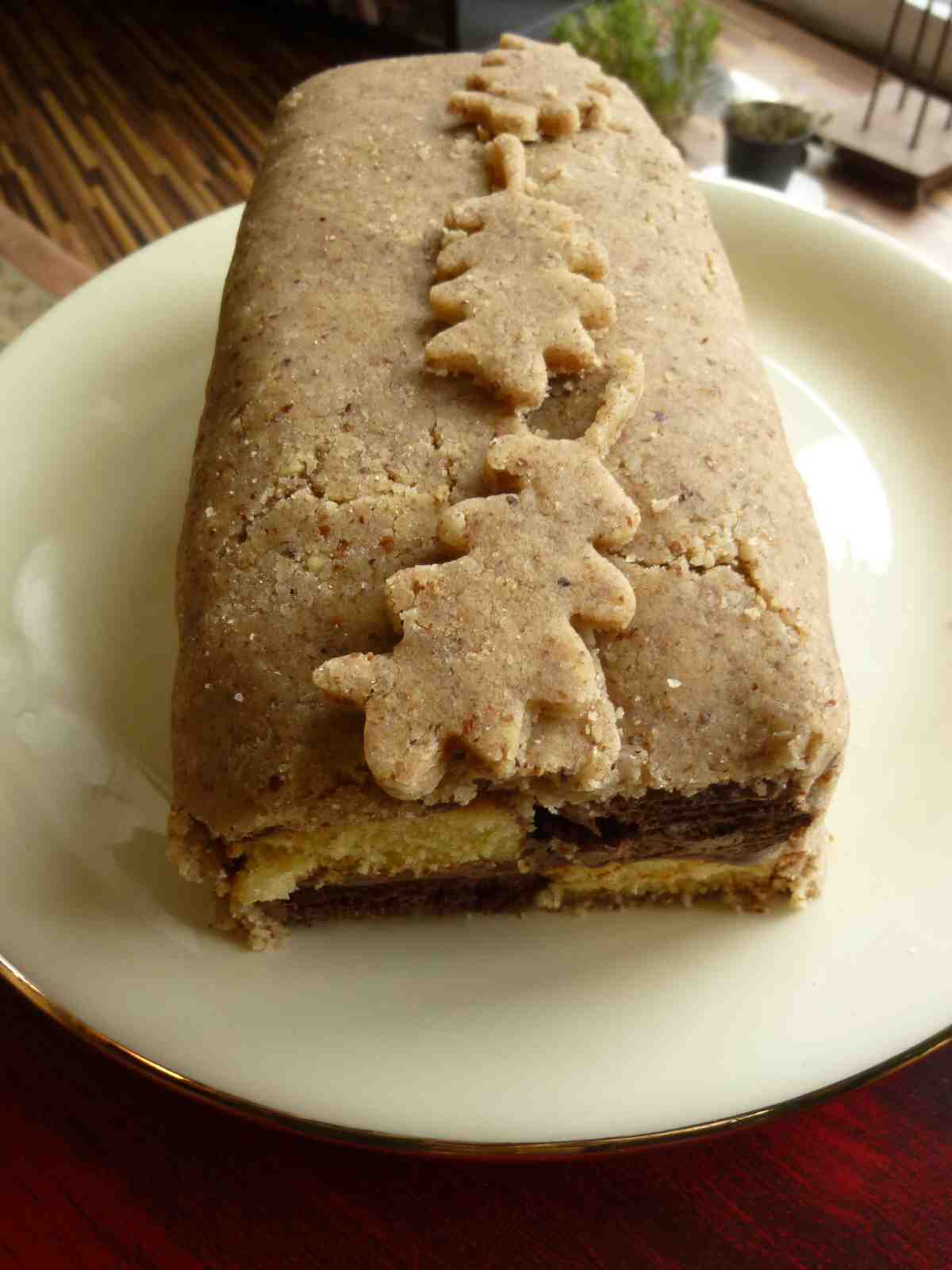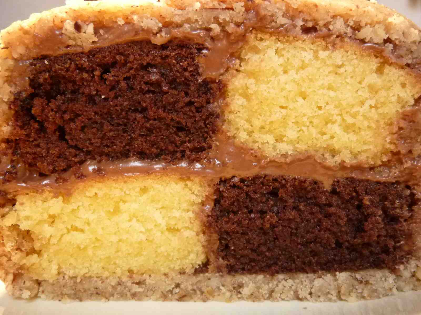 After baking and cooling. I trimmed off the uneven parts, halved each cake loaf lengthwise and stacked the pieces. The cake is “glued” together with hazelnut cream. I thought about making my own but I broke down and used Nutella instead.