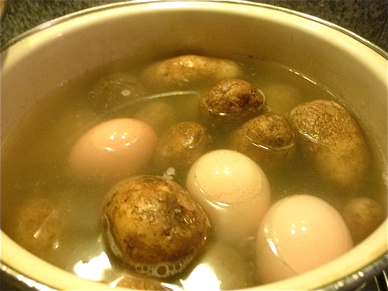 *Fine says to make the potatoes the day before and festkoch them which means to cook them until they are soft but still firm, not mushy.
