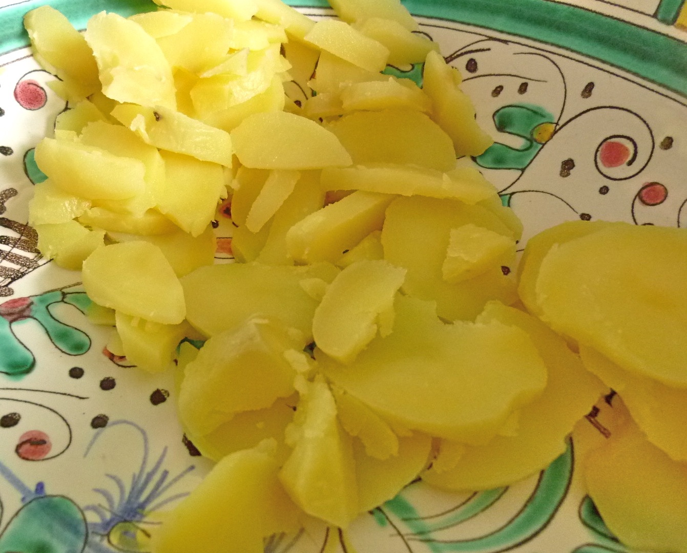 Taste and then, if you want, you can add a bit more sugar and vinegar until you have the balance of sweet and sour that is right for you. Let the sauce sit while you peel the cooled potatoes: