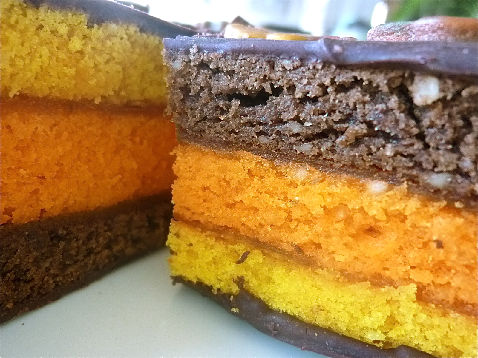 3) Instead of the Italian flag colors. I used Fall shades. I created the yellow, orange and brown shades by coloring the layers with Wilton gel food coloring in Golden Yellow, Orange and Brown.