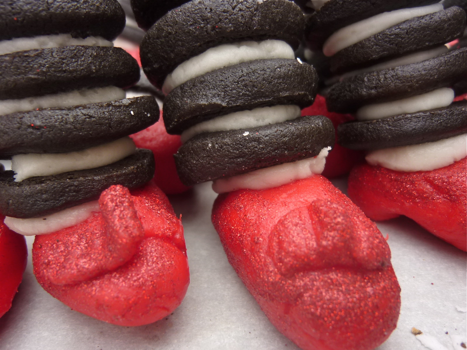 The only changes I made to her recipe were purely cosmetic. Using Wilton’s black food coloring gel, I made the chocolate cookies black and I also used disco dust instead of glitter for the ruby slippers as well as adding the bow embellishment.  There will be a lot of drag queens at this party tonight so I have changed the name to “Bitch I’m Gonna Drop a House on Yo’ Ass” cookies.