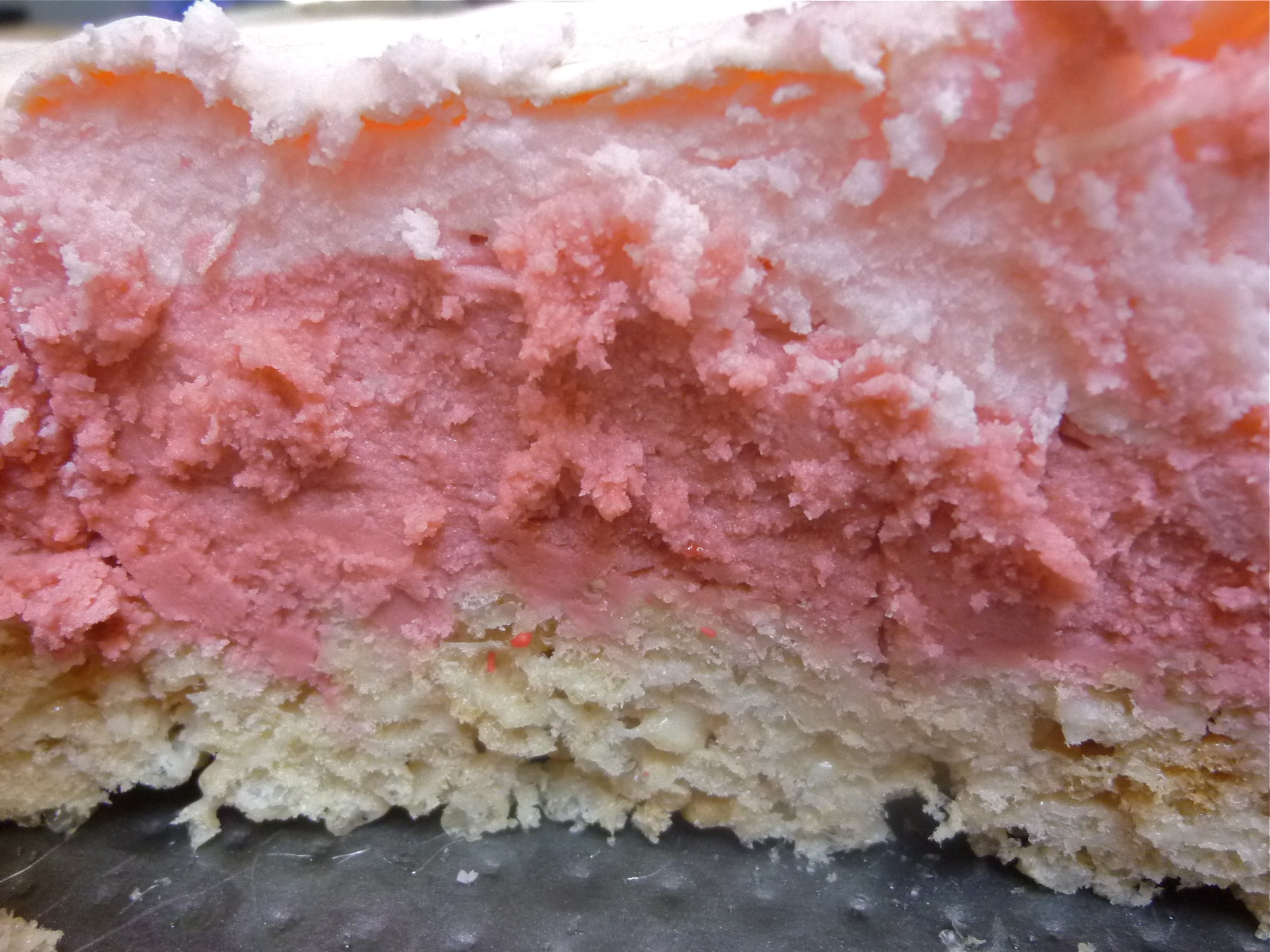 I layered the buttercream on in two layers, light pink first and then the darker pink on top. If you put the pan in the fridge for about 30 minutes after adding the first layer of buttercream, it makes adding the second layer easier.