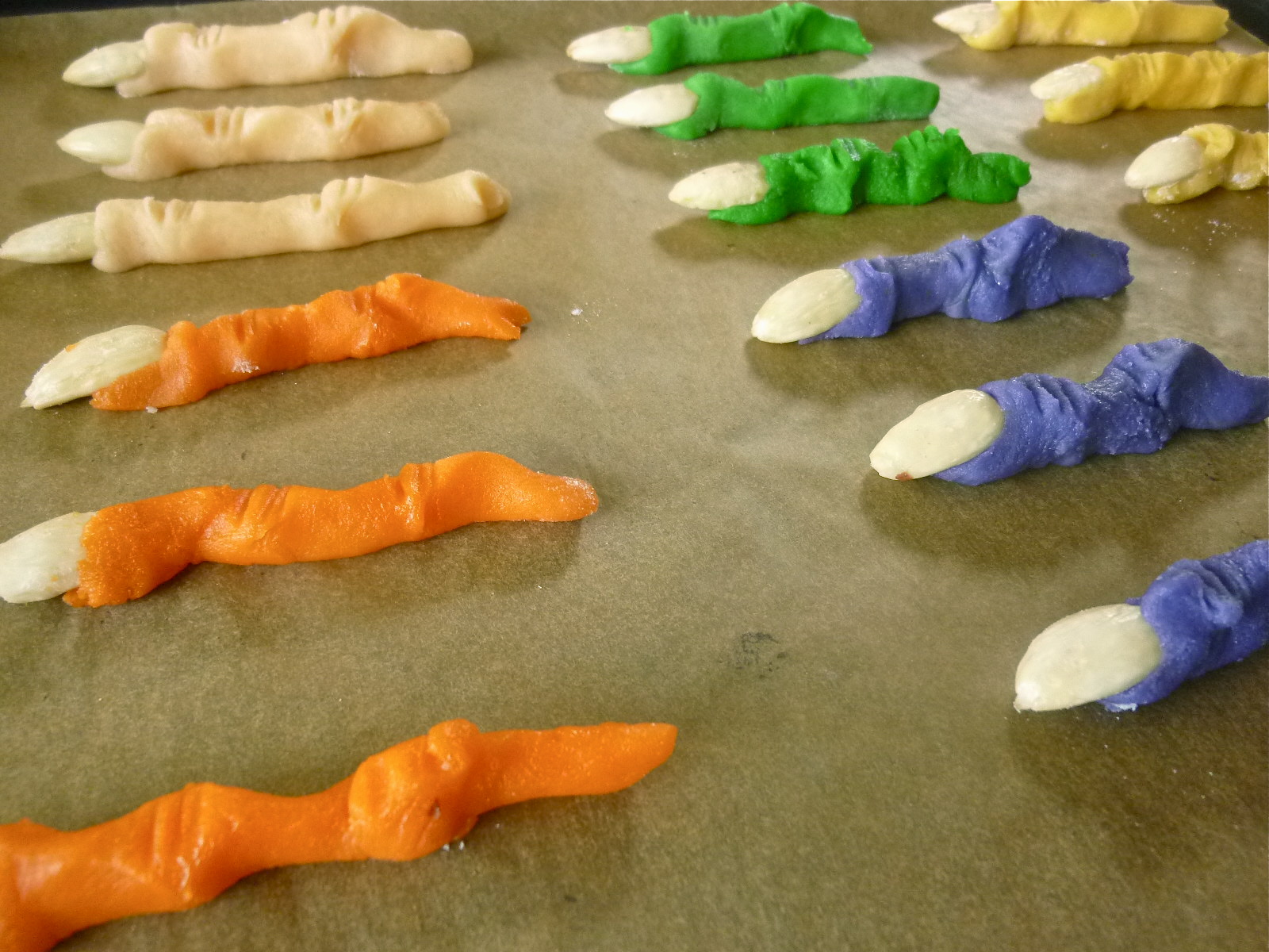 After rolling out the dough into fingers, you squeeze where the knuckles to be to form them and use a toothpick to make the indentations. Then press an almond in one end for the fingernail.