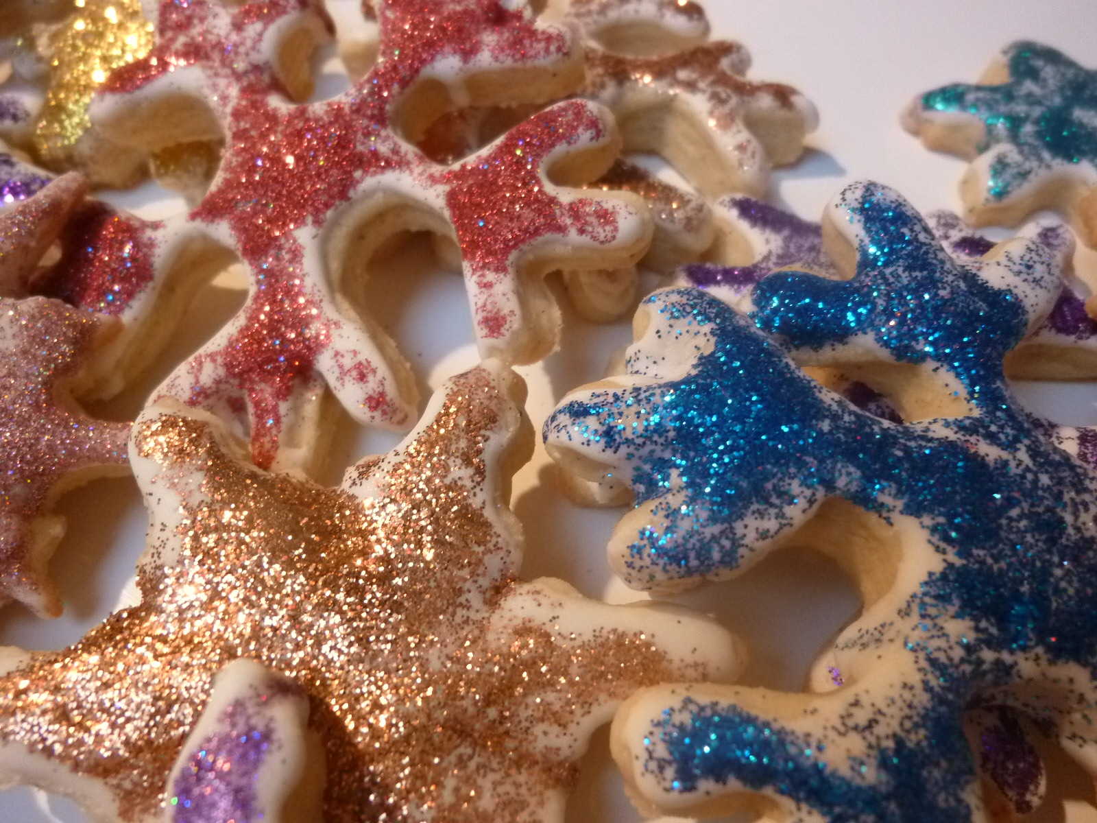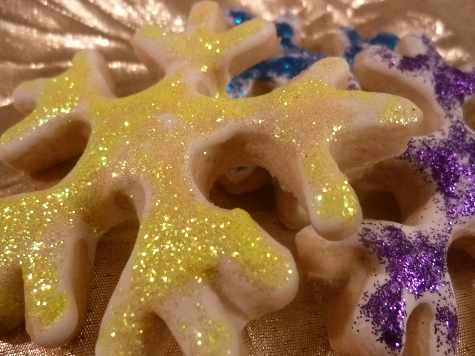 Last year I did these blue, white and silver pastel snowflakes out of a plain sugar cookie recipe.
