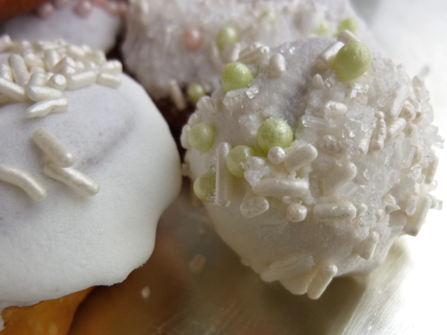 - One at a time dip the doughnuts in, and hold them over the pan to drip off the excess glaze. Then immediately dip the glazed doughnut into the decorations (sprinkles, glitter, pearls, etc.)