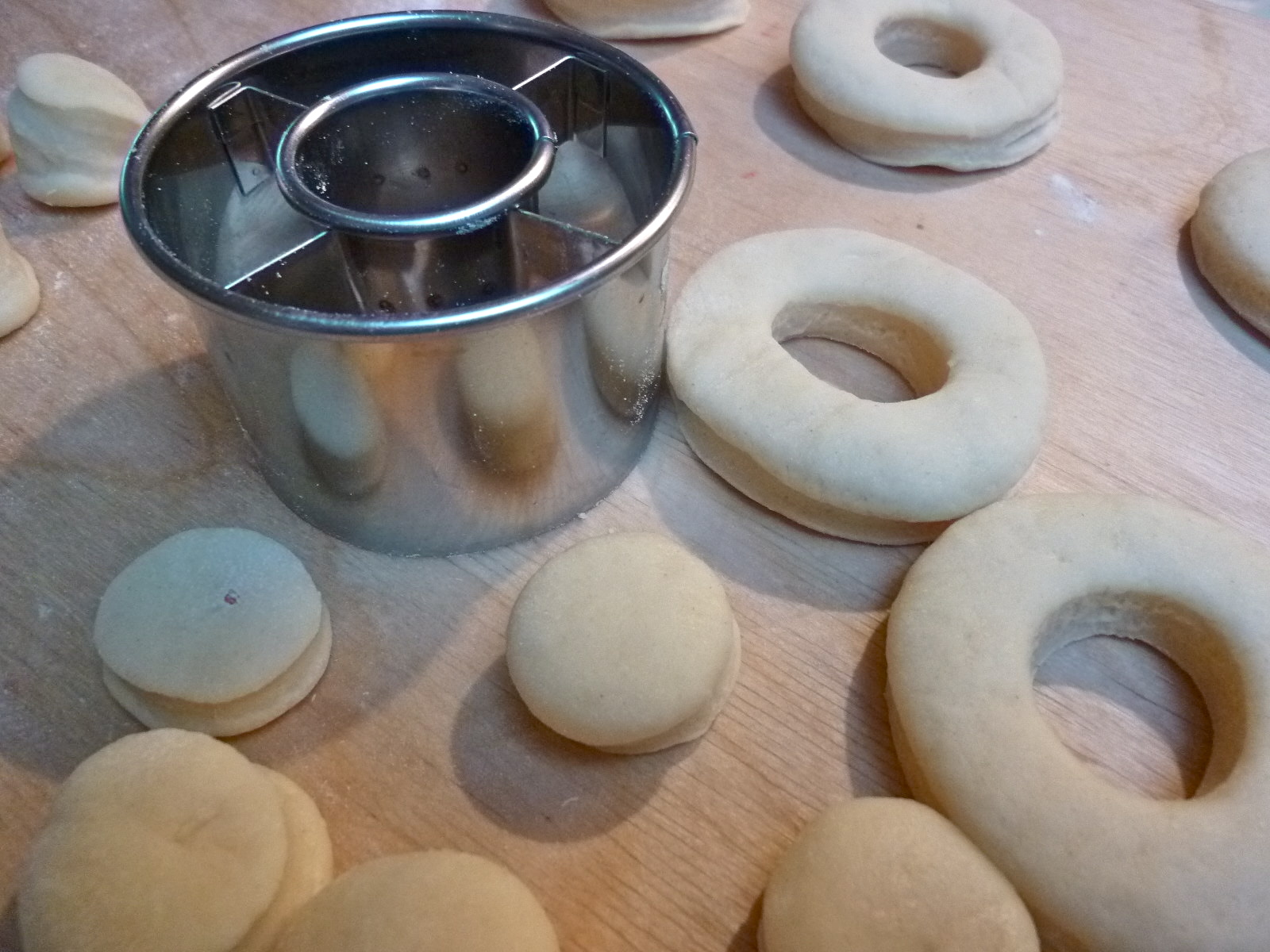 I used a small doughnut cutter to shape these Mint Frosted Doughnuts. Of course, I saved the holes to fry up as well.