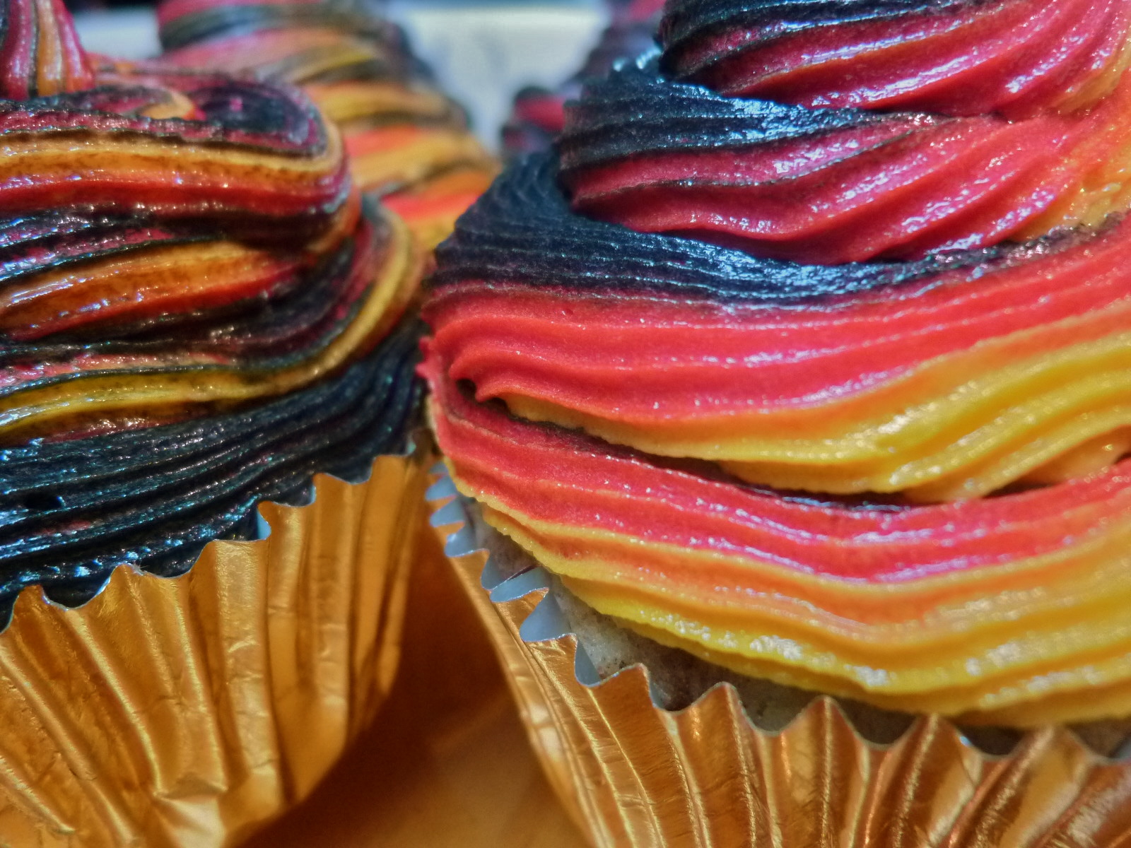 These cupcakes reflect both sides of my international life, flavors of both German and American.  Furthermore, I colored the peanut butter buttercream to represent the colors of the German flag.