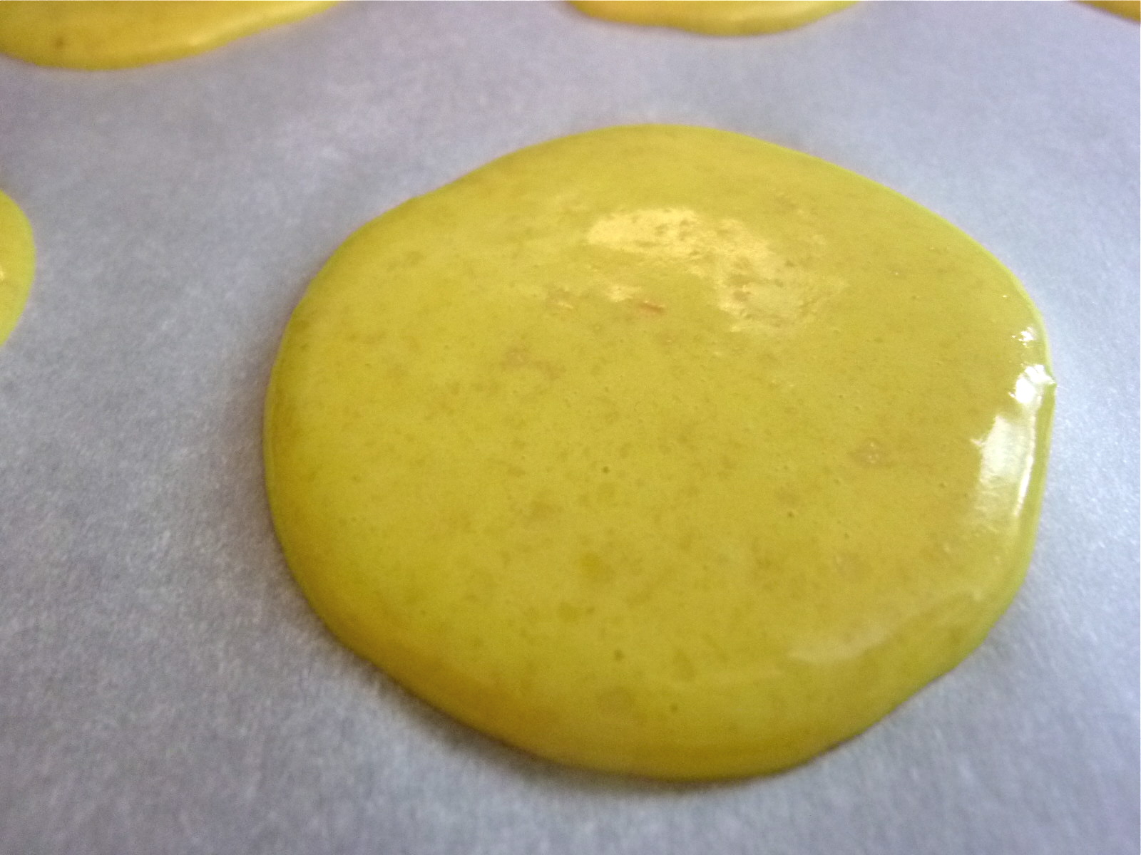 - Add the powdered sugar/almond mixture to the egg white mixture and fold, using quick strokes at first then slow down. No more than 50 strokes all together. The batter should have a “flowing like lava” consistency. Here is where I added a dab of yellow gel food coloring and 1 teaspoon of lemon extract.