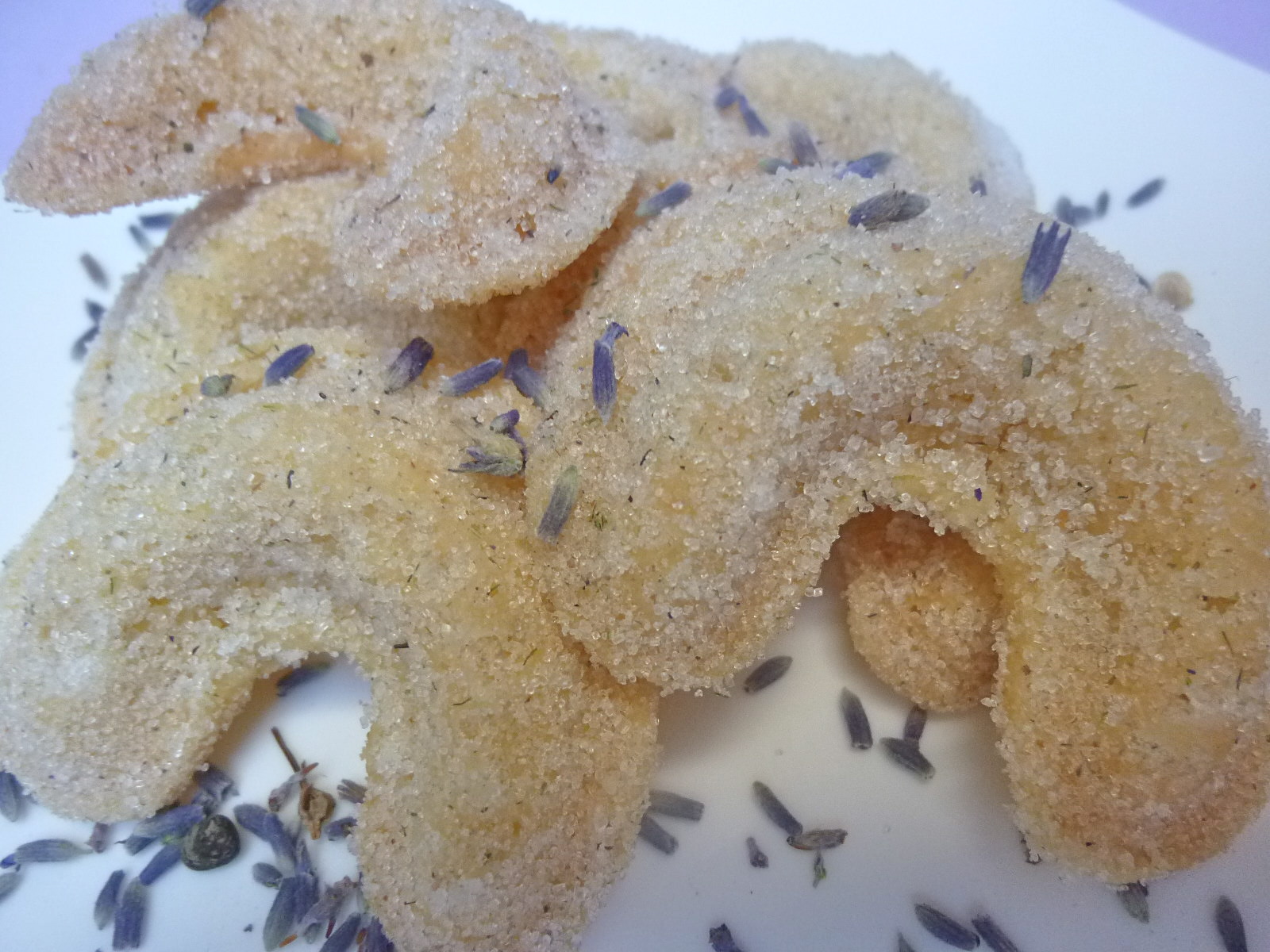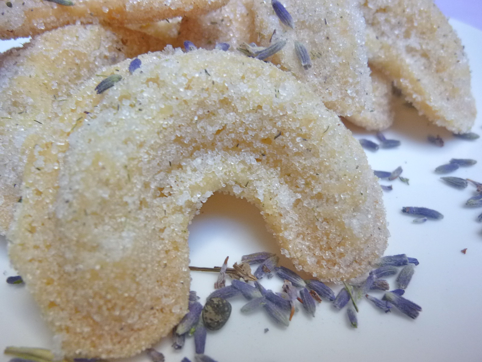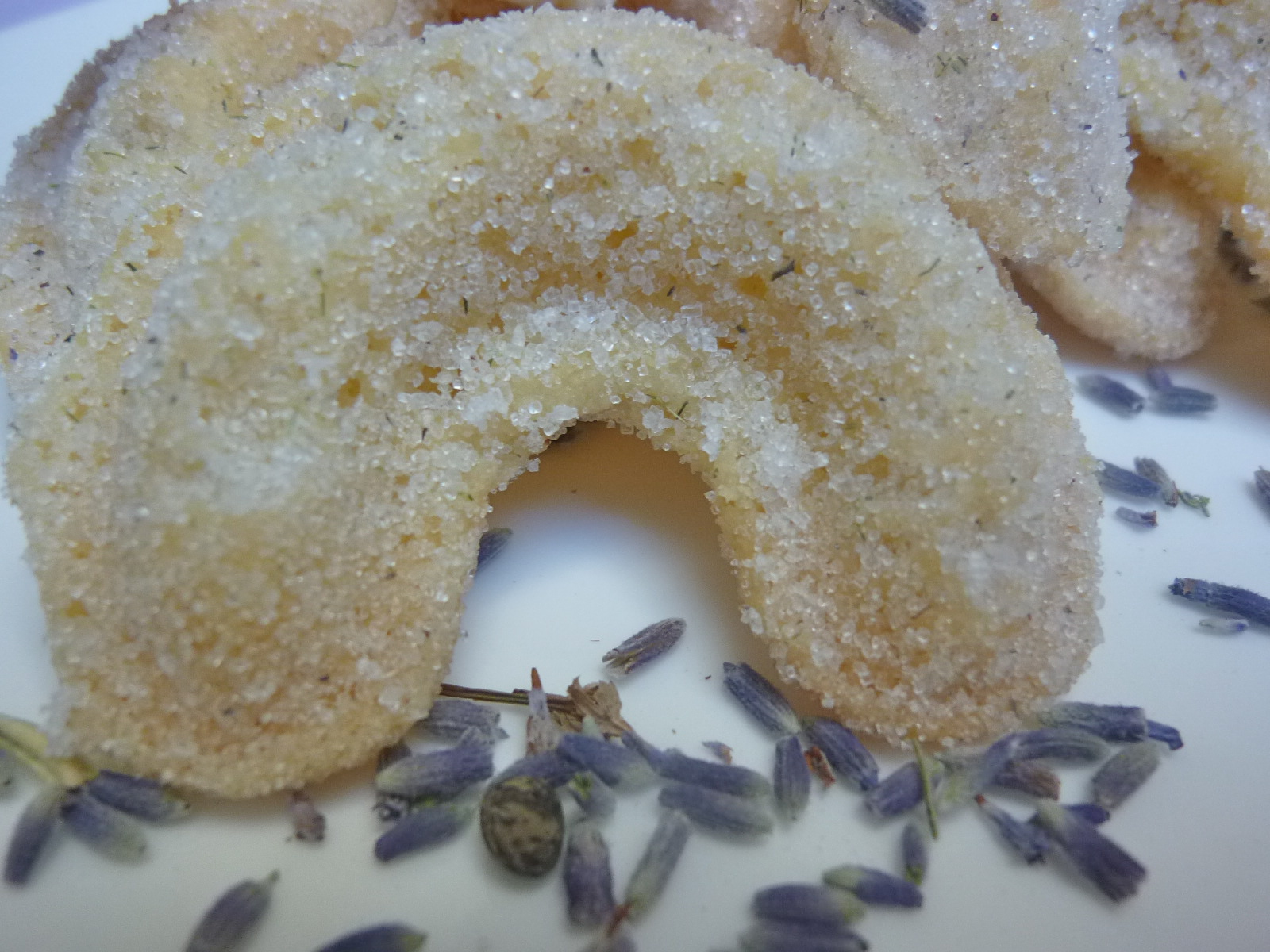 • Directly after removing the kipferl from the oven sprinkle with the remaining half cup of lavender sugar.