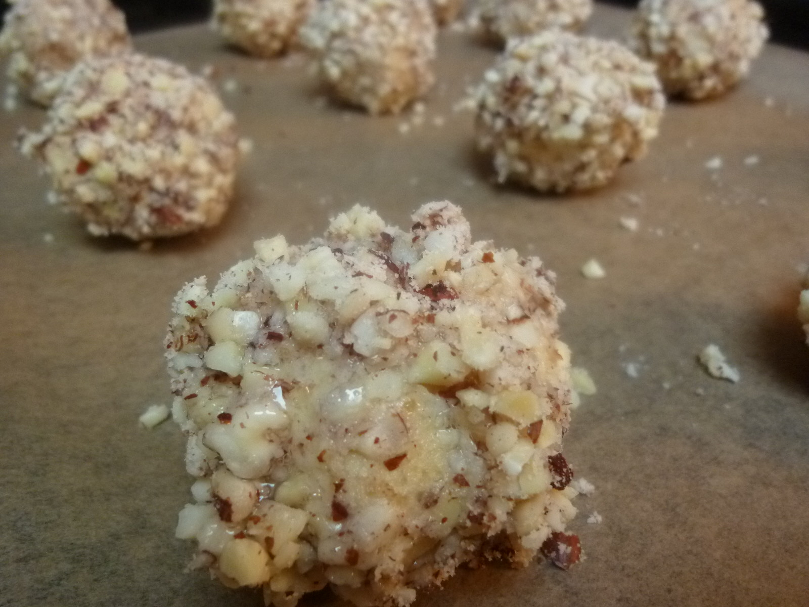 - Dip the dough ball into the egg white, roll in the nuts, and place the cookie on the baking sheet.