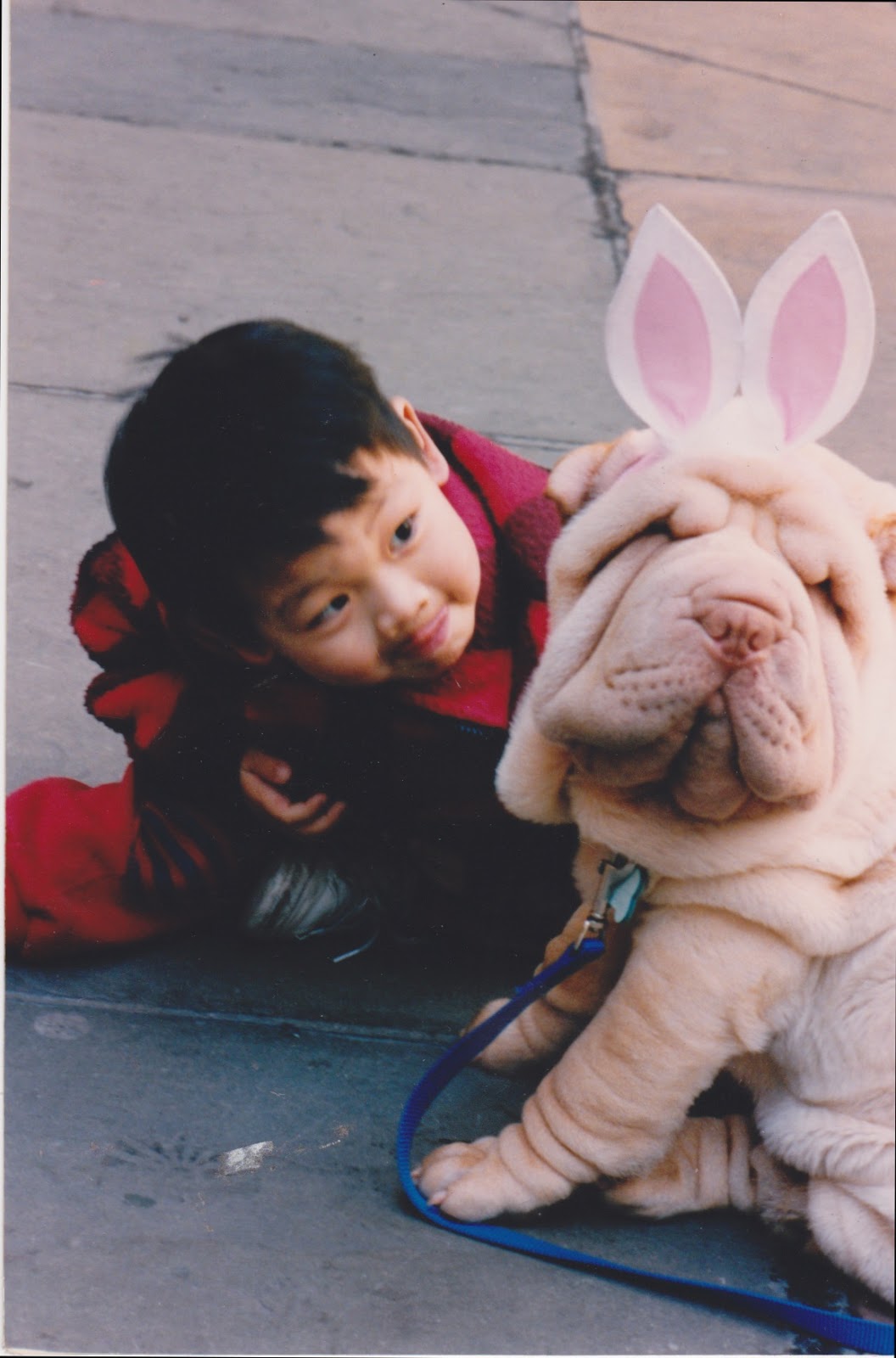 The Easter parade in NYC is a random affair. Like the song, it takes place on Fifth Avenue and draws all kinds of Easter headgear from the austere to the outrageous.One year I brought Teddy, one of my Shar Pei puppies to the parade. He looked so perverse in bunny ears, I just had to.