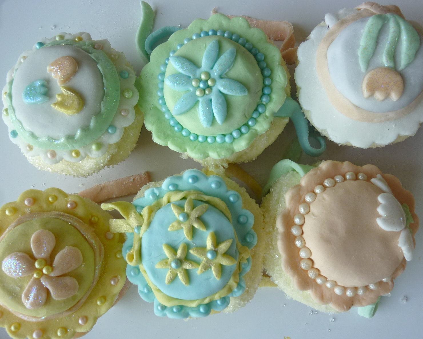 I didn’t go with outrageous. I was feeling all pastel-ee and took my inspiration from these pearl decorations and then colored marshmallow fondant to be all matchy matchy.