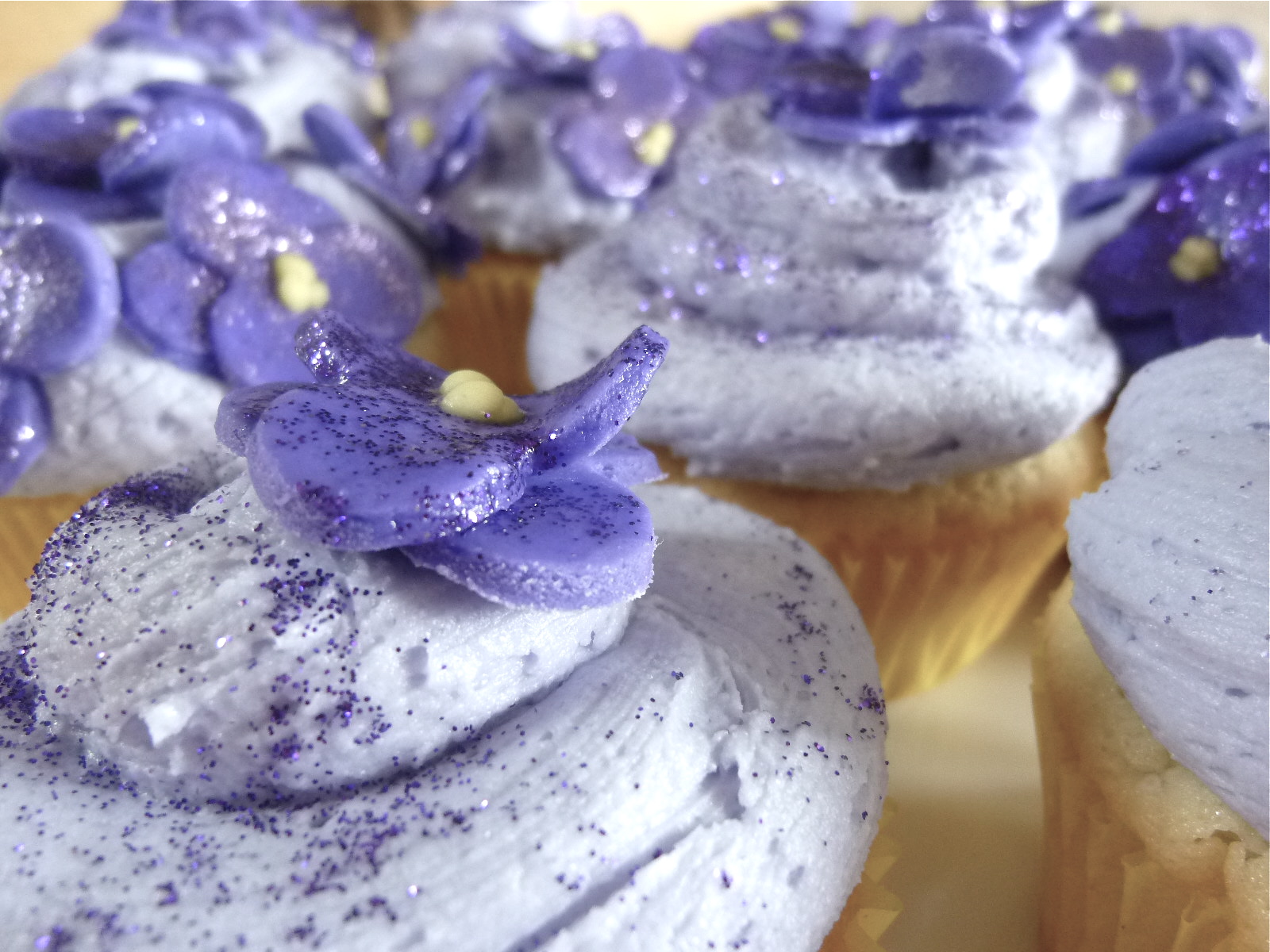 - Arrange violets on the cupcakes. To apply disco dust, dip paintbrush into alcohol and brush the fondant violets. then dip the same brush in the disco dust and spread over the area where the alcohol is.