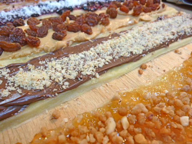 The Solution is this torte. It’s called a torte in my German cookbook, but it’s more pastry-like. Each piece is rolled up individually, so there is plenty of room to tuck in surprises. Why make each section the same when every piece could be a mystery bite?