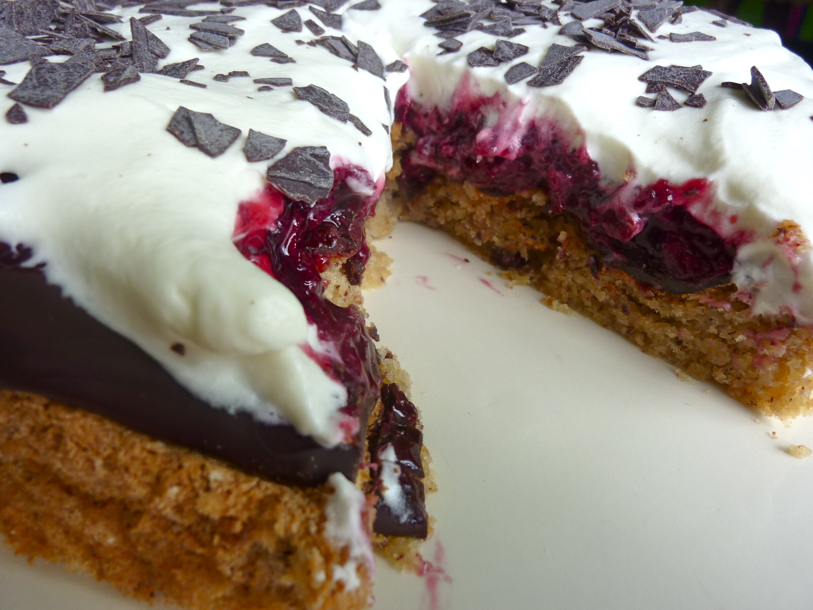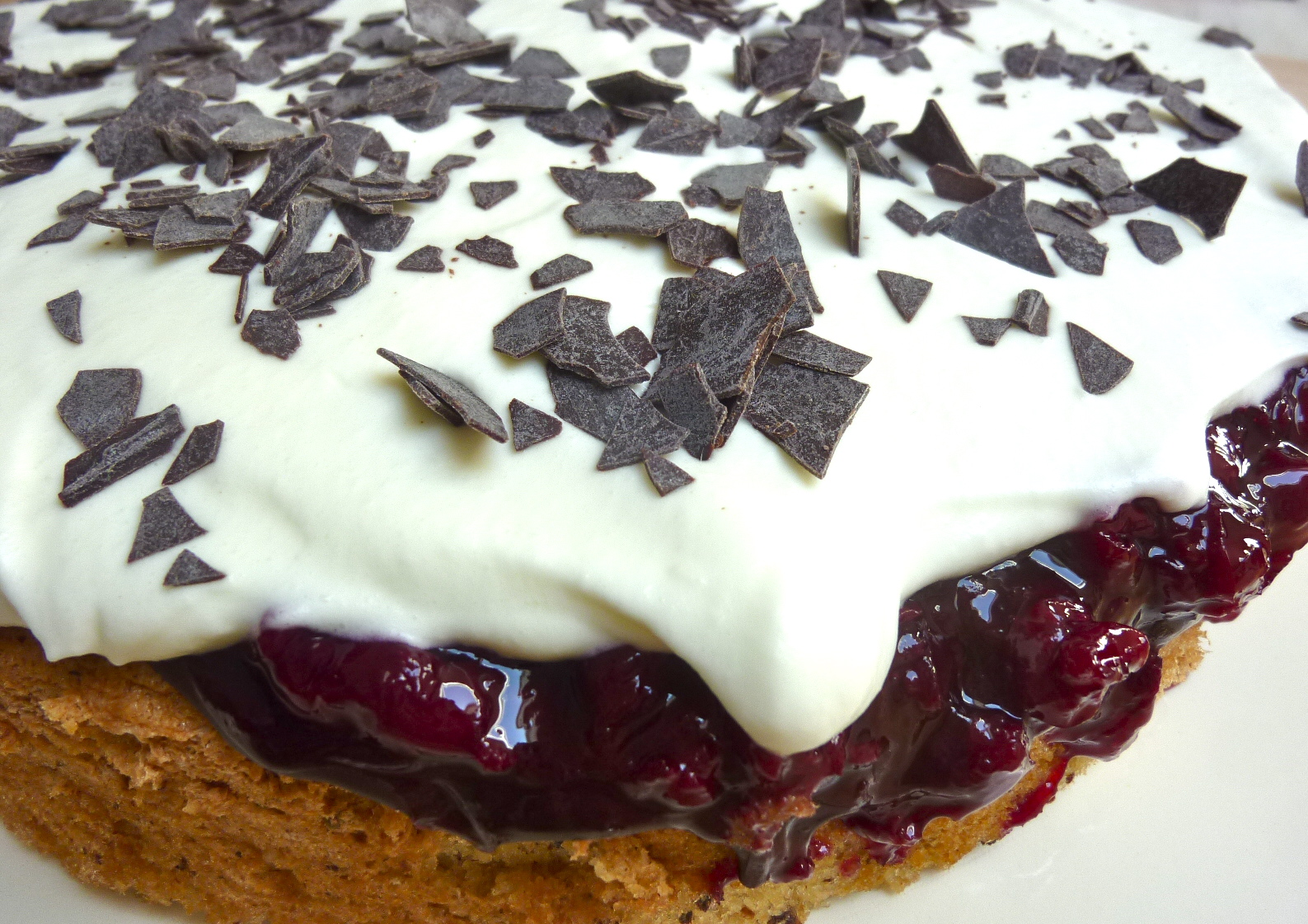 The cake base layer is simply eggs, hazelnuts and sugar. After baking, melted chocolate is poured over, then a layer of sour cherries and the torte is topped with whipped cream. What’s not to love?