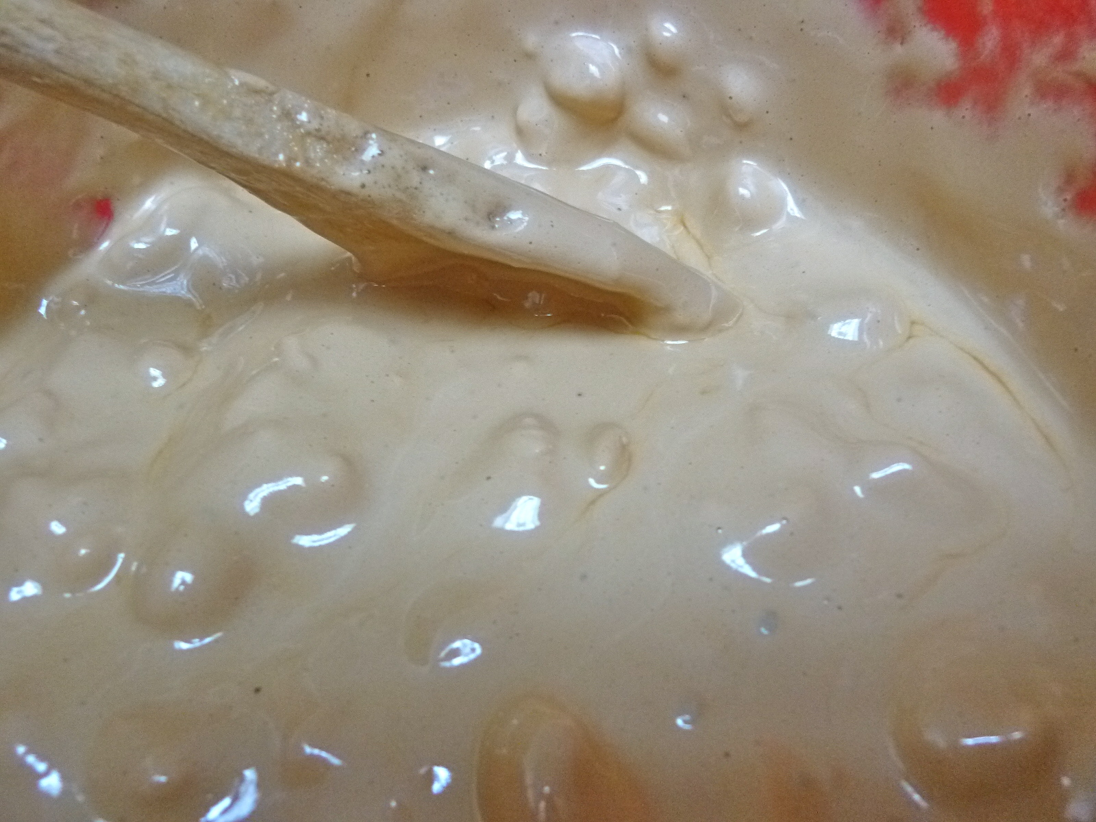 The bowl went into the microwave for 30 seconds. I took out the bowl and stirred the marshmallows with a wooden spoon greased with Crisco. Then it went back into the microwave for another 30 seconds and the mixture was stirred again until all the marshmallows were melted.