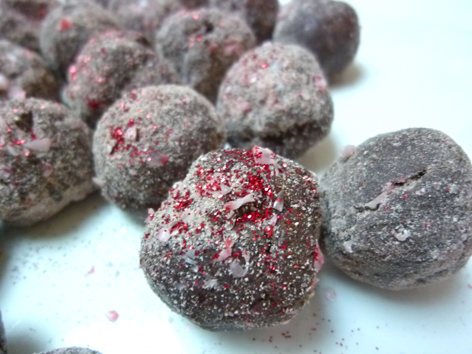 LOL…I laughed reading your descriptions of these truffles. Don't be too critical with these truffles. They are innocent! LOL I think they look lovely with a tint of reds from the crushed candy cane.