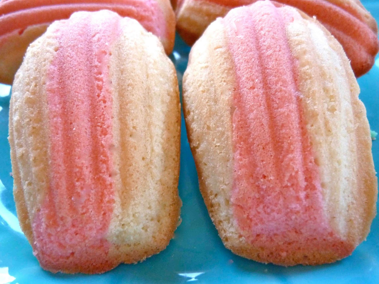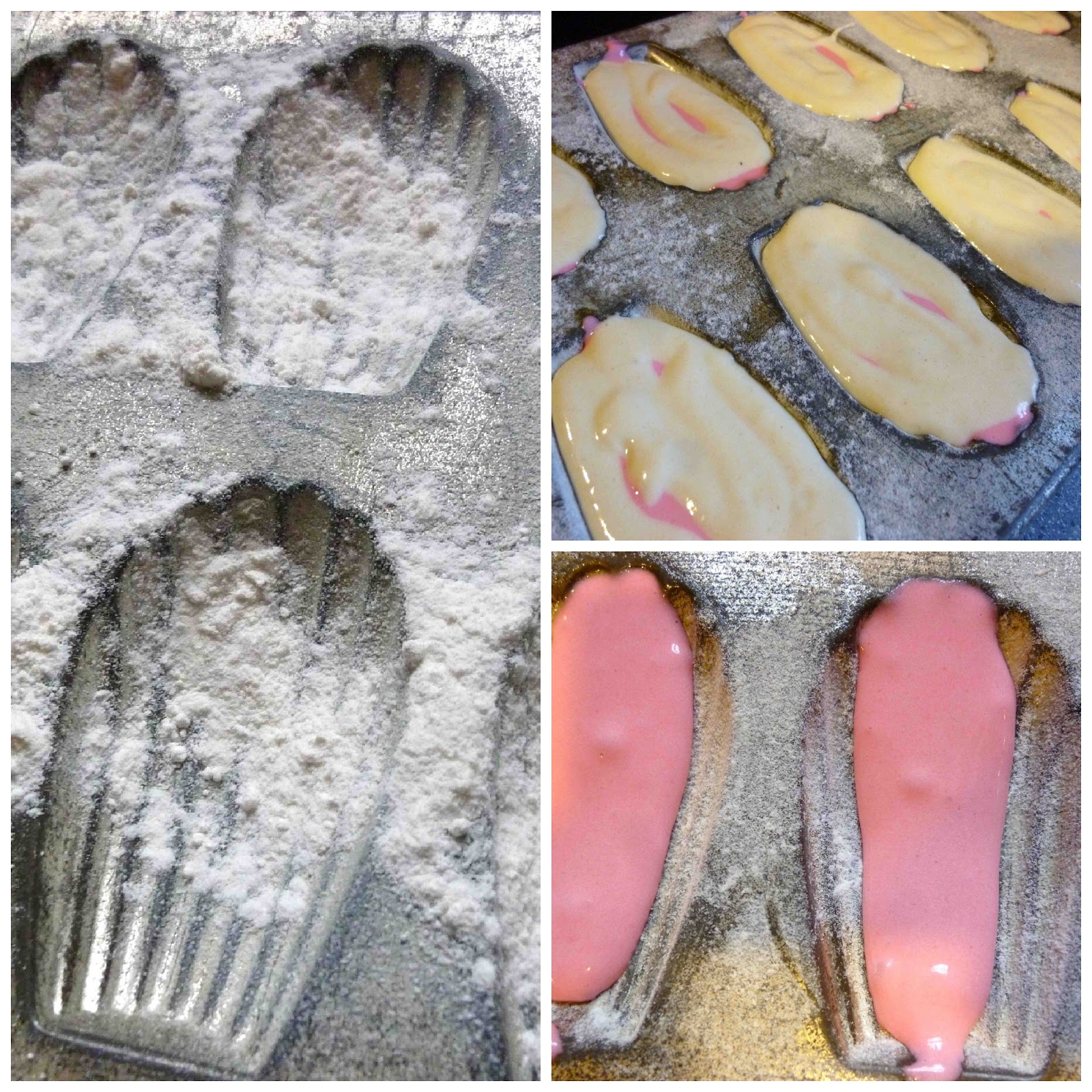 To make these I used this recipe referenced by Sugar Swings. I separated some of the batter and colored it pink, then piped a stripe into greased and floured Madeleine molds, piping the rest of the uncolored batter on top.
