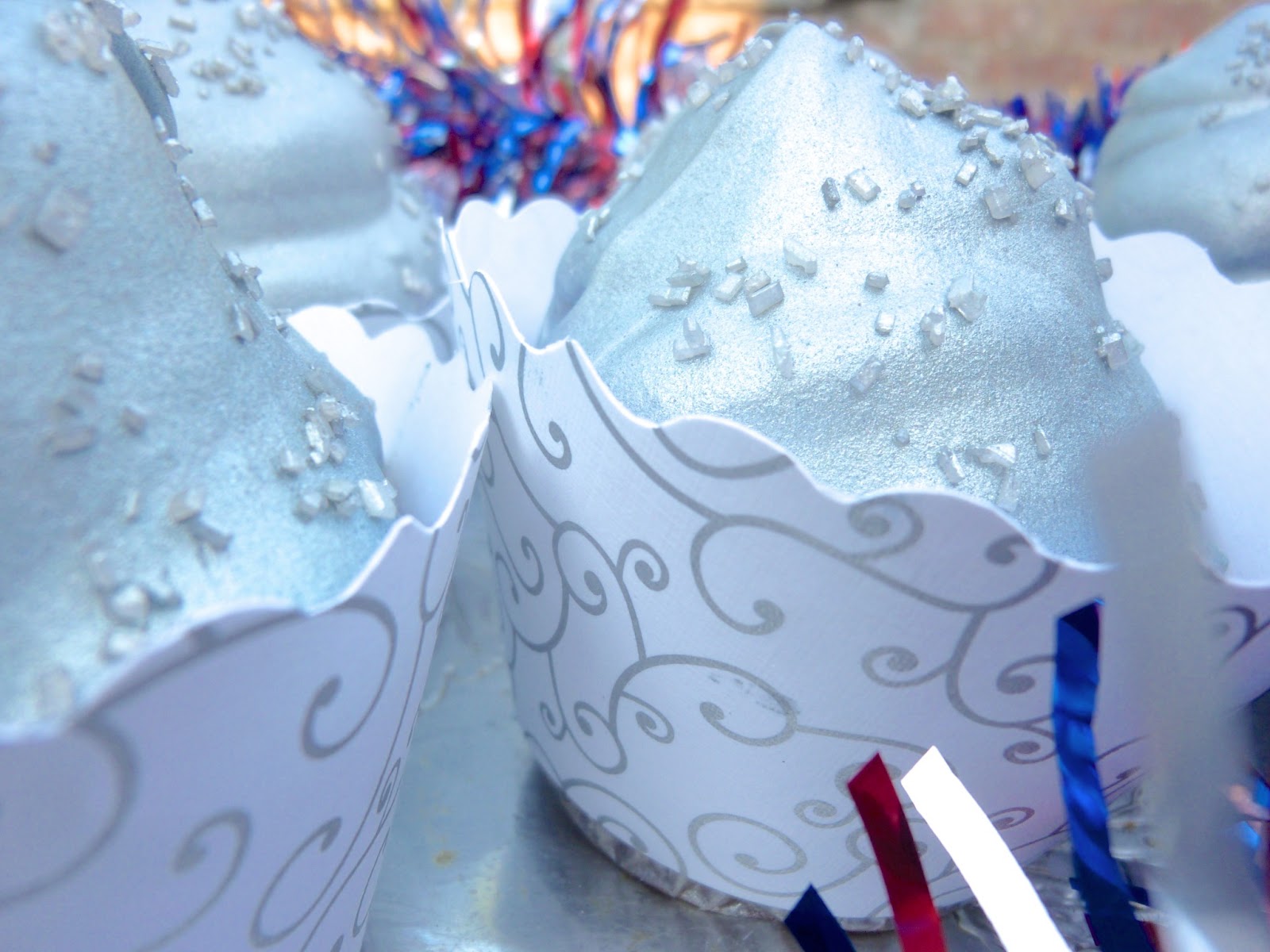 Wow – I've never seen a silver hi hat cupcake. They go brilliantly with the silver cupcake wrappers. And then to sneak red and blue frosting inside was very neat. Great job!!