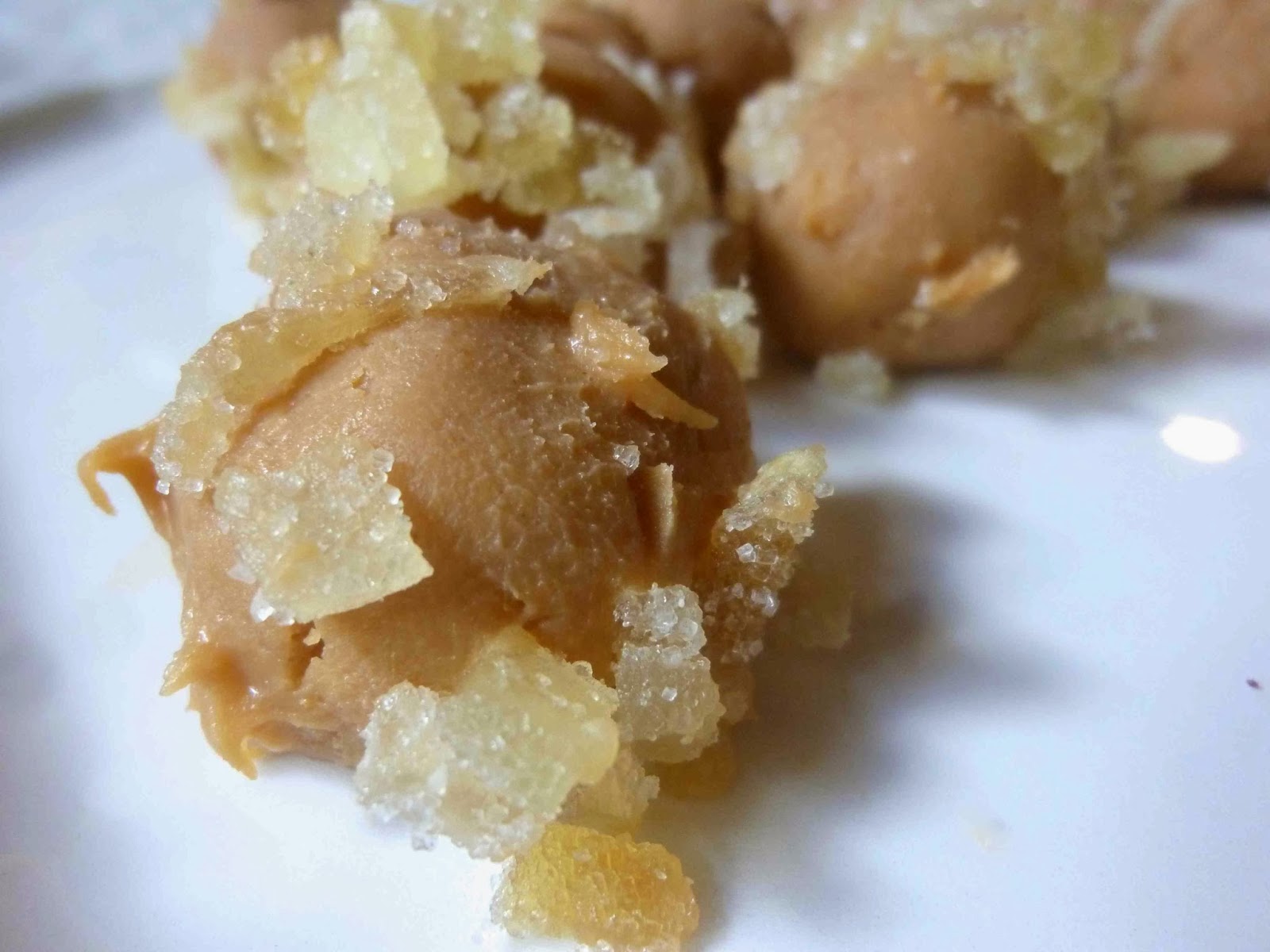 So this butterscotch ginger truffle was born. The butterscotch bits do not firm up as well as chocolate, so instead of keeping them in the fridge I opted for the freezer which worked a bit better.