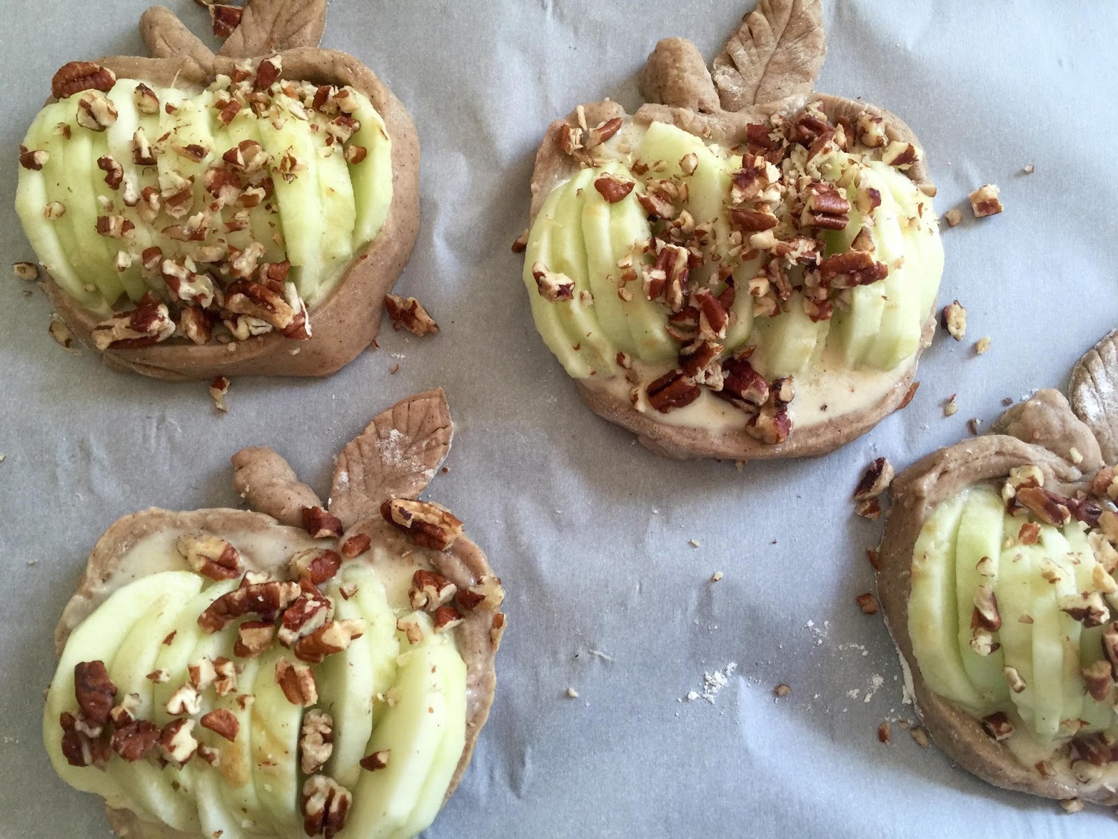 These tarts are roughly four inches in diameter. Of the thousands of cookie cutters I have stashed in undisclosed locations, I could not seem to locate my large apple shaped one. I improvised by using the bottom of a small round spring form pan to cut circles out of the dough and then shaped them into apples with my fingers.
