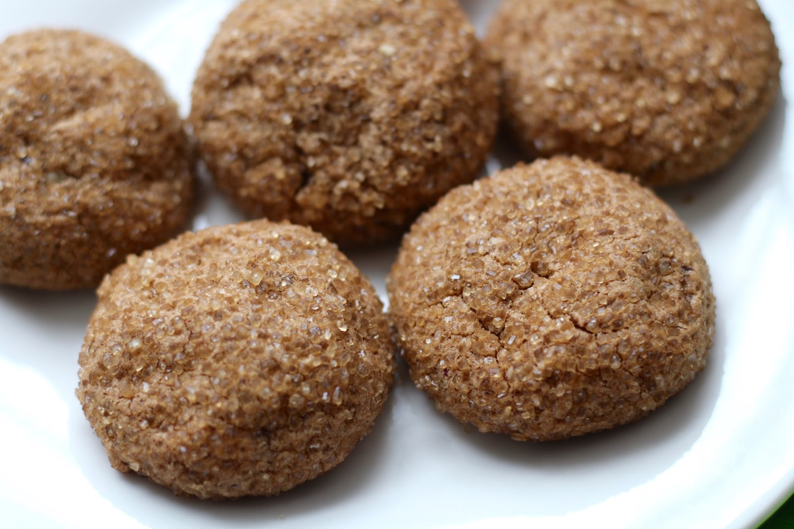- Taking one tablespoon full of dough at a time, roll the dough between your hands into a ball, then roll the ball in the demerara or raw sugar on the plate, place the cookies on the baking sheet.