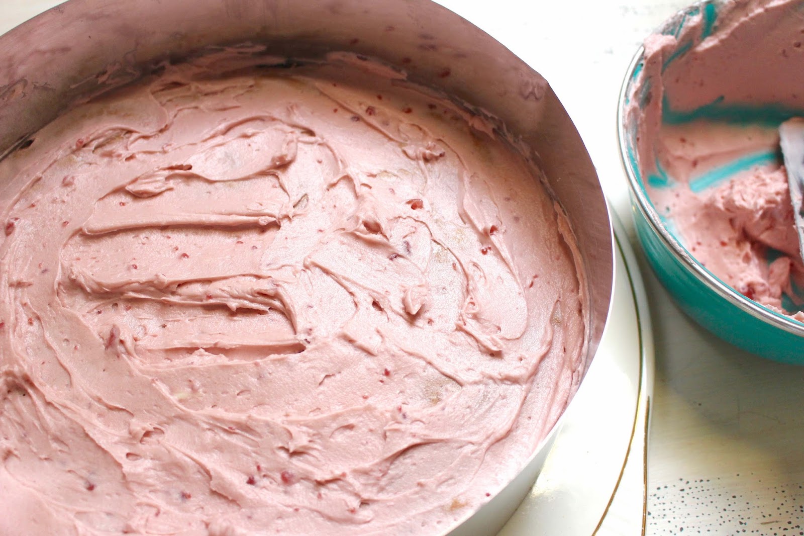 - Place one circle on a serving plate. If you have a torte ring, place it around the cake. If you don’t you can use the ring from the springform pan.