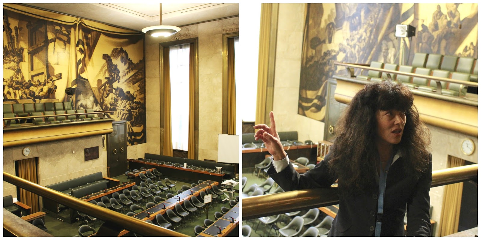 Below is the Council Chamber. The murals, created by Catalan artist José María Sert were gifted by Spain. They depict human progress through health, technology, freedom, and peace. Many historical events happened in this room, one being the negotiations to end the Gulf war in 1991.