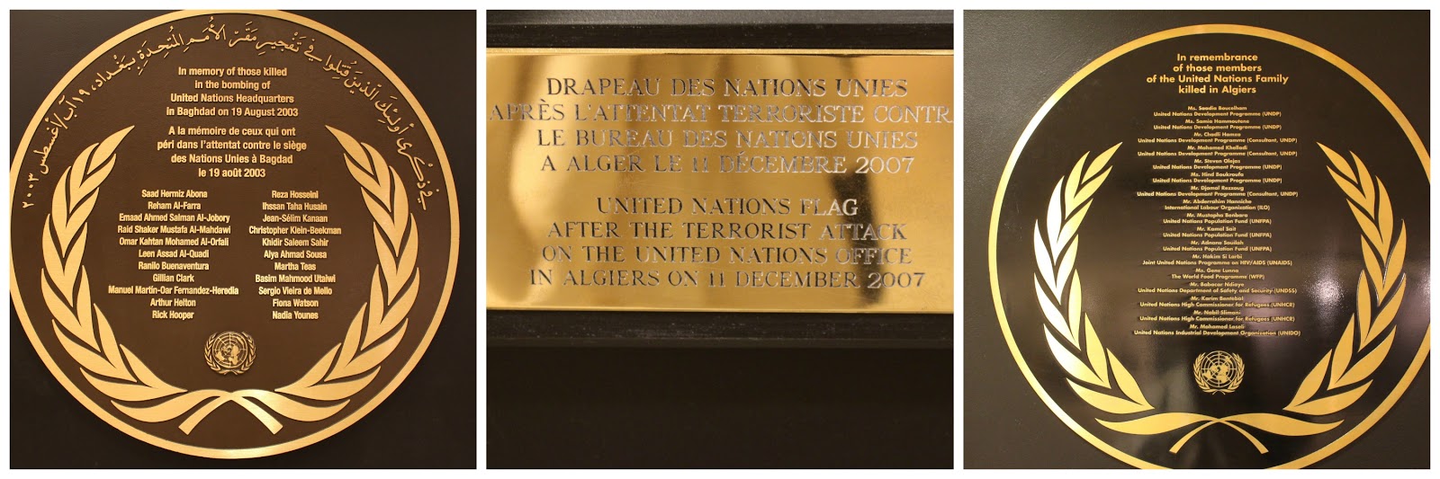 Baghdad and Algiers offices were both attacked by terrorists. Many lives were lost. The flag is what remained of the UN flag after one of the attacks.