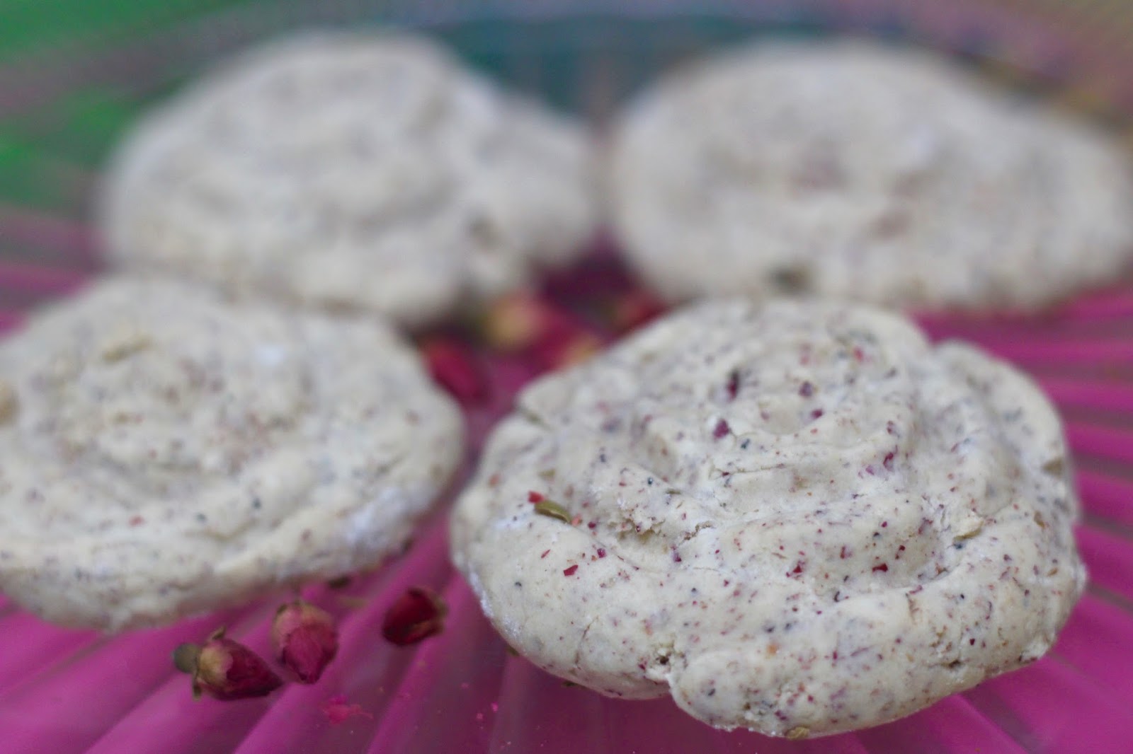 - When the cookies have cooled enough to handle, transfer to a decorative platter. For a decorative serving touch, sprinkle some additional whole dried rosebuds and/or toasted anise seeds over the platter and serve.