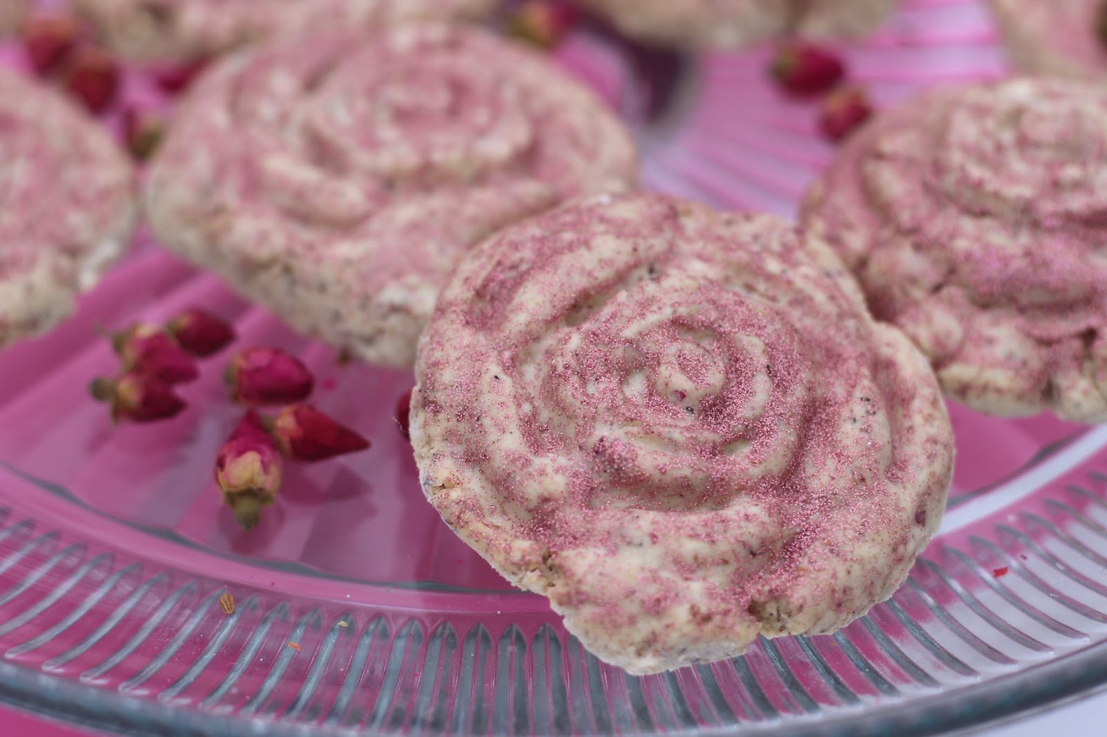 Although the crushed dried rose petals make them look pretty on their own, you know I was not going to let these go without some sparkle. For an extra decorative touch, I brushed pink hologram disco dust on the cookies once they had cooled.