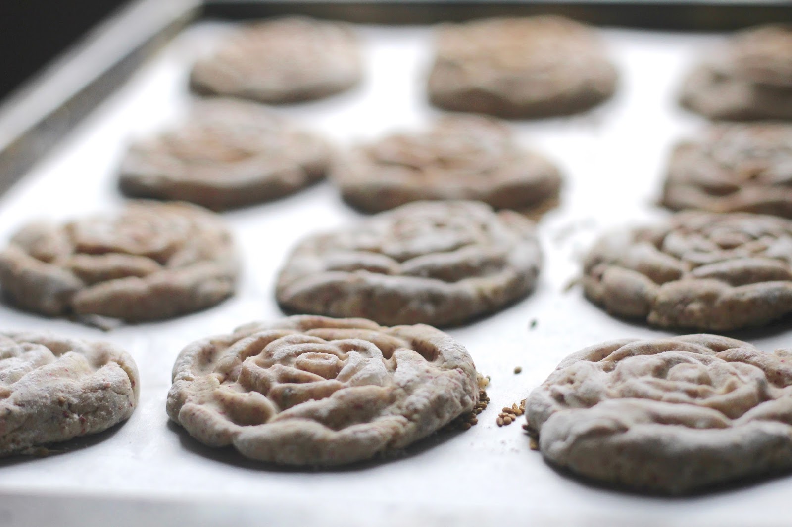 - Sprinkle anise seeds on the baking sheets.