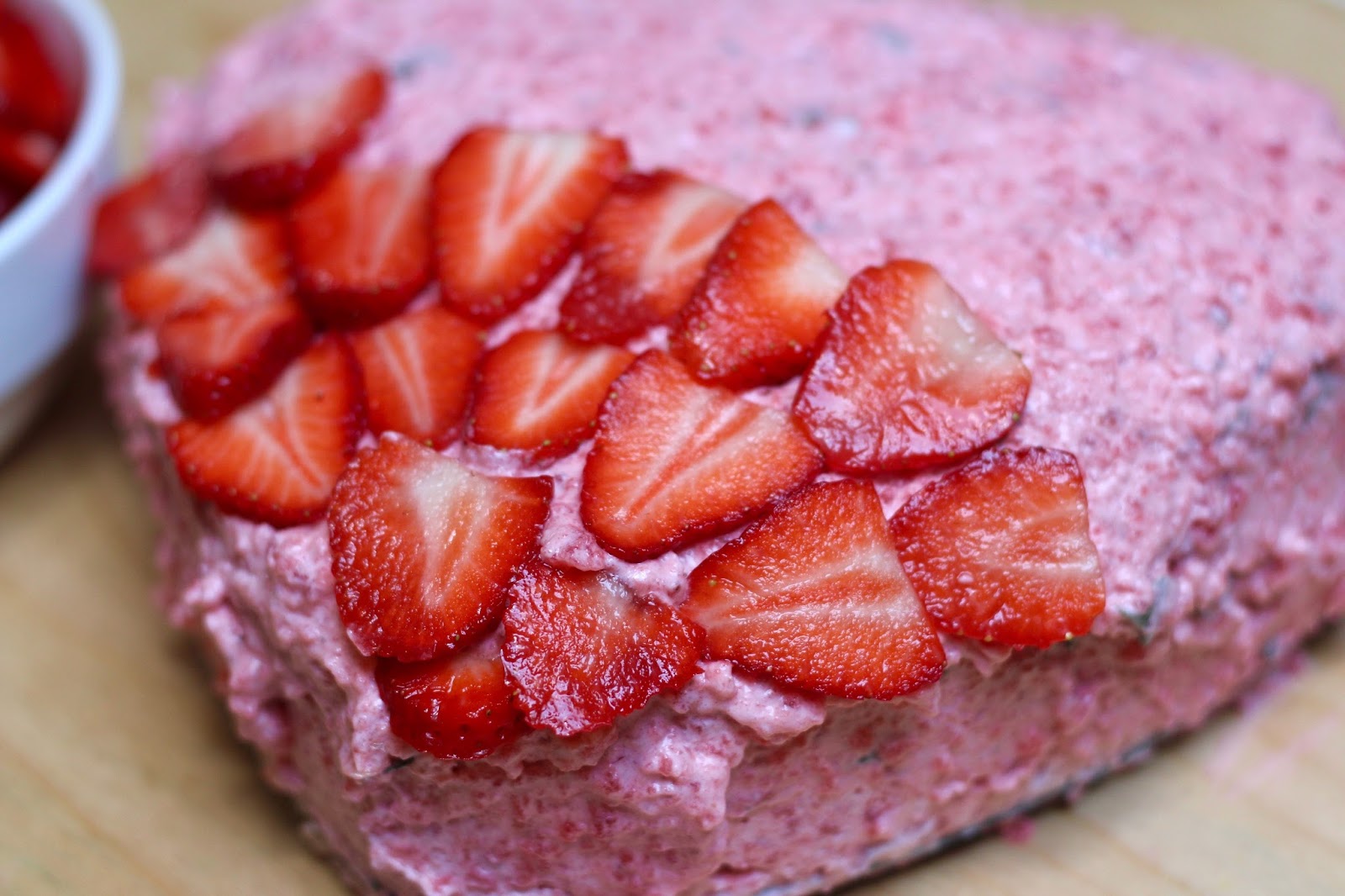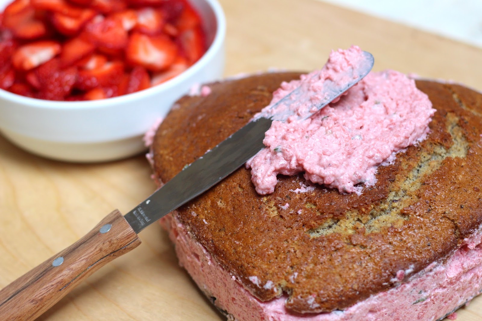 Remove the cake from the refrigerator. Remove the outer ring and spread the remaining room-temperature strawberry cream over the cake to cover it.