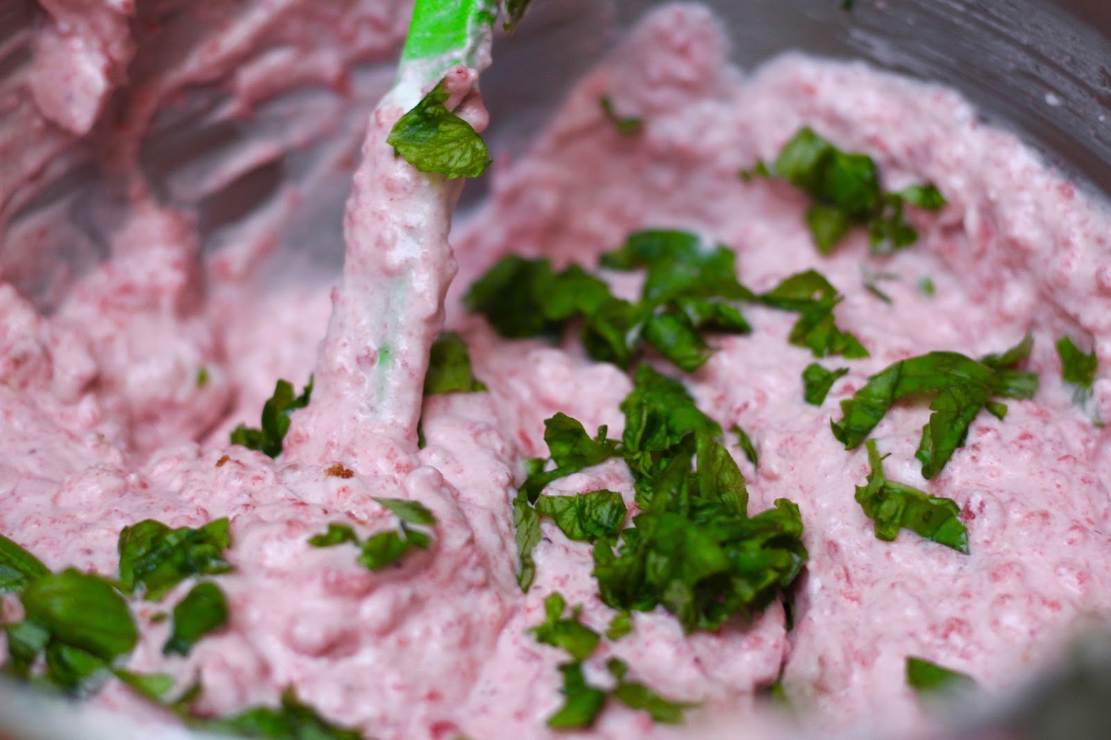Remove the cooled strawberry puree from the fridge. Fold in the strawberry cream cheese mixture. When it is fully combined, fold in the whipped cream. Then fold in the fresh chopped basil.