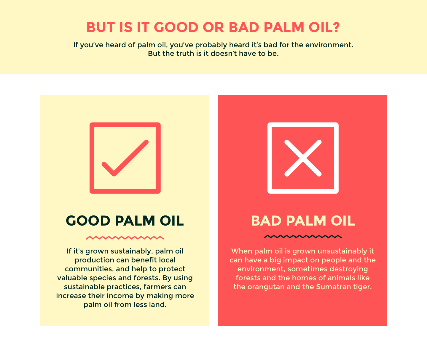 The production of ‘bad’ palm oil is rapidly destroying virgin rainforests and ecosystems and causing air pollution to rise and putting many species at risk of extinction. If grown sustainably, ‘good’ palm oil can benefit local communities with fair working conditions and help protect valuable species and forests.