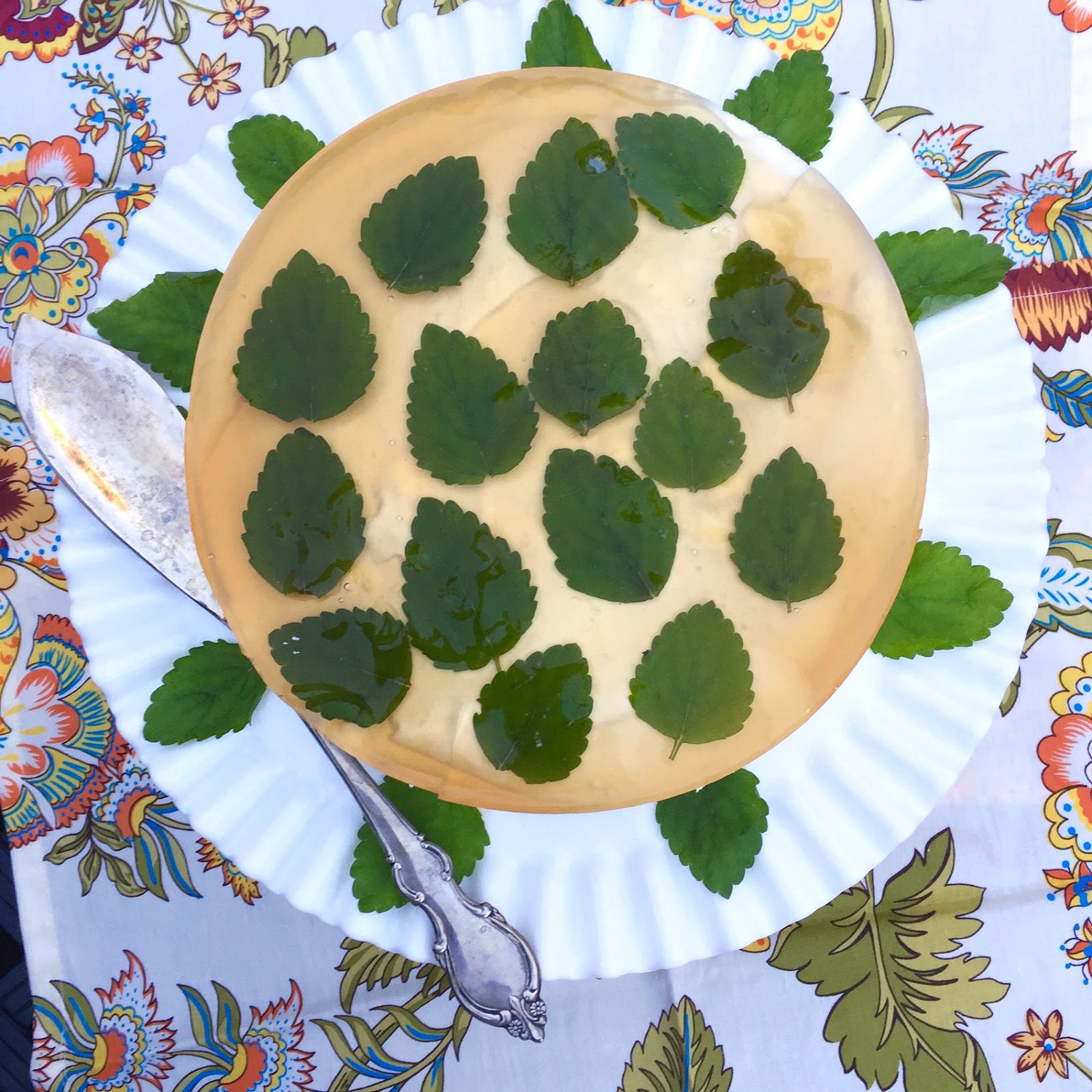 6. Place the lemon balm leaves on top of the lemon gelatin layer in a decorative pattern.
