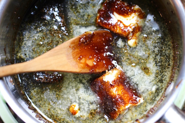 In a small saucepan over medium heat, melt the butter molasses and 1/2 cup brown sugar. Stir to combine everything well.