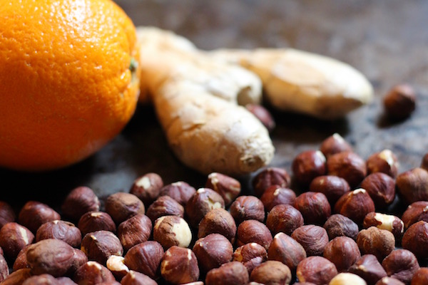 Heat the hazelnuts in a naked skillet until the skins have loosened. Transfer to a cutting board. When cool enough to handle, roll them with your hands to separate the skins.