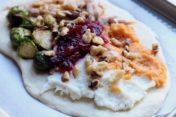 Cover each oval with selections of your Thanksgiving leftovers. I used mashed potatoes, mashed sweet potatoes, roasted Brussels sprouts, leftover shredded turkey, and cranberry sauce. Sprinkled raw walnut pieces over the tops before placing the flammkuchen in the oven.