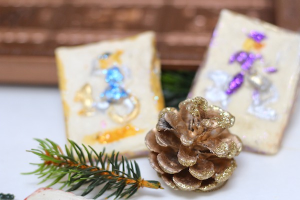 Springerle are traditional German christmas cookies made with special hand cut wooden molds and often exquisitely painted. I have no exquisite painting skills, so I razzle dazzle with disco dust.