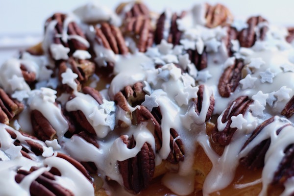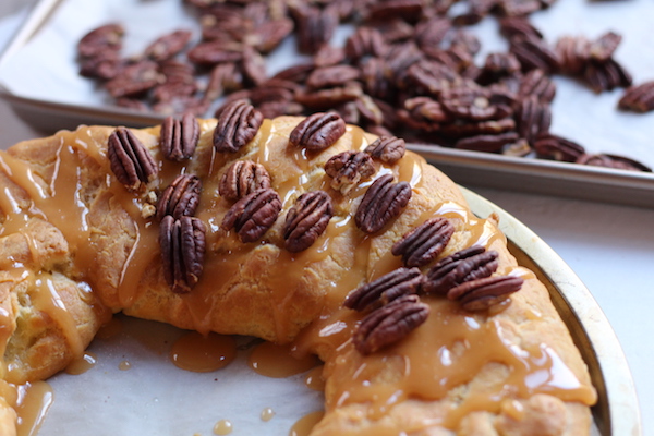The recipe is all about layering. First, a dough base is made, then another cake layer on top, then baked. After that, it’s a matter of layering caramel, toasted whole pecans and vanilla butter flavored sugar glaze over the baked ring.