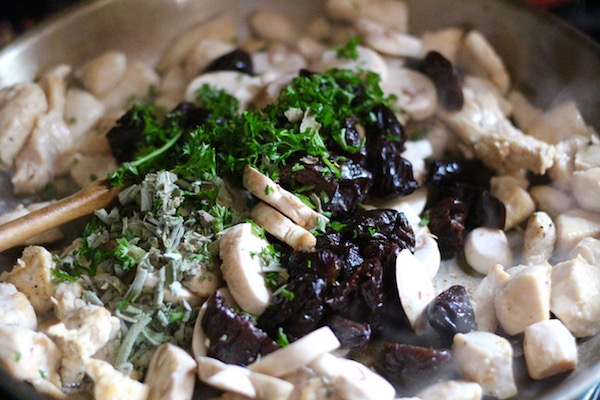 Add the mushrooms, sage, prunes, and parsley and stir to combine. Cook for about 5 more minutes, until the mushrooms start to soften a bit. Remove from heat and set aside.