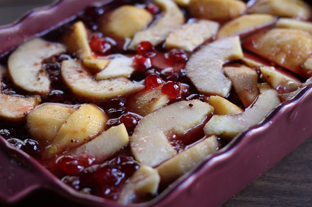For this recipe, The quinces are poached in a wine, honey, lemon concoction. You can do this a few days ahead to save time. The dried cranberries add a decorative and sweet-sour flavor. The almonds add crunch.