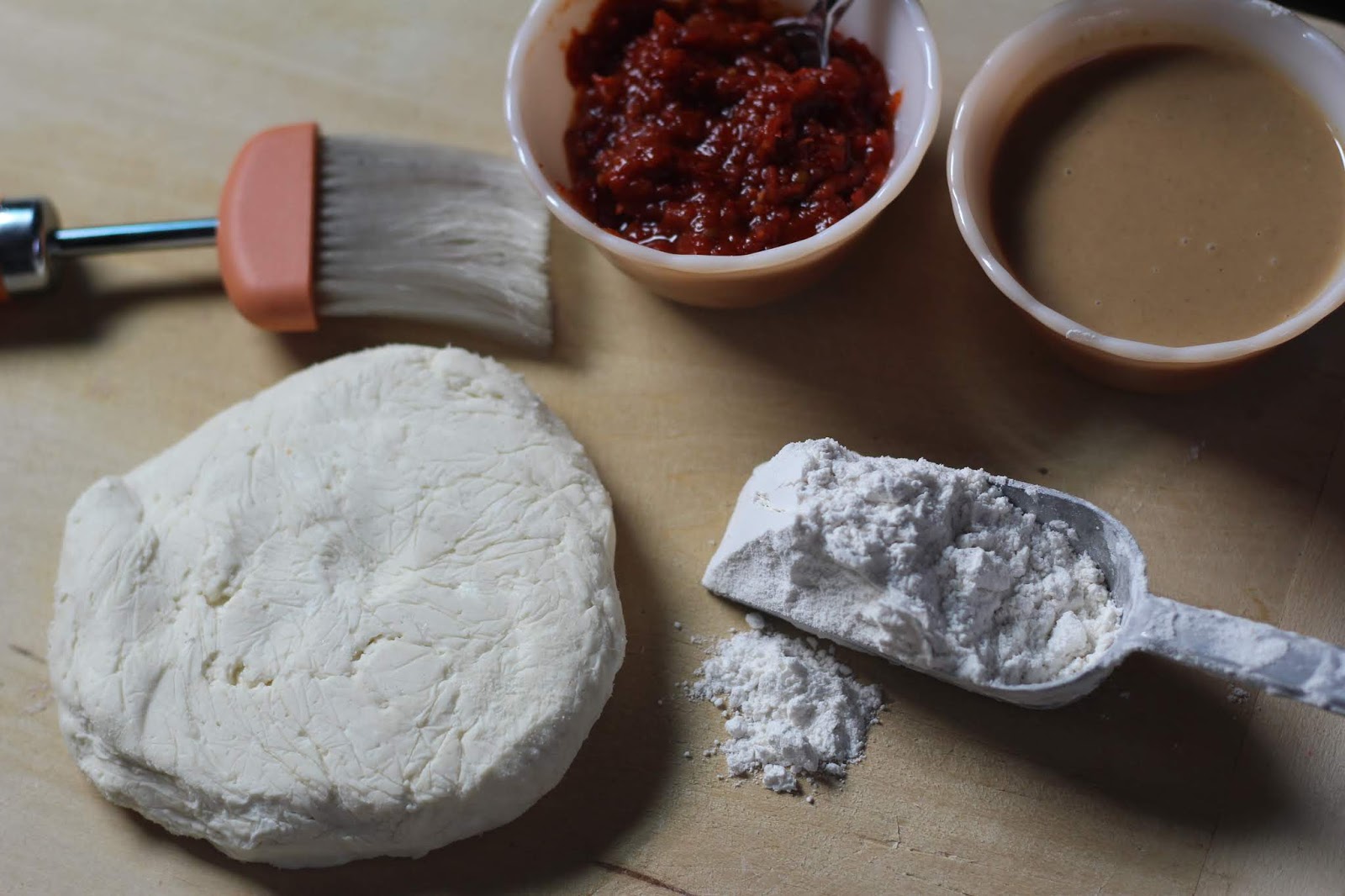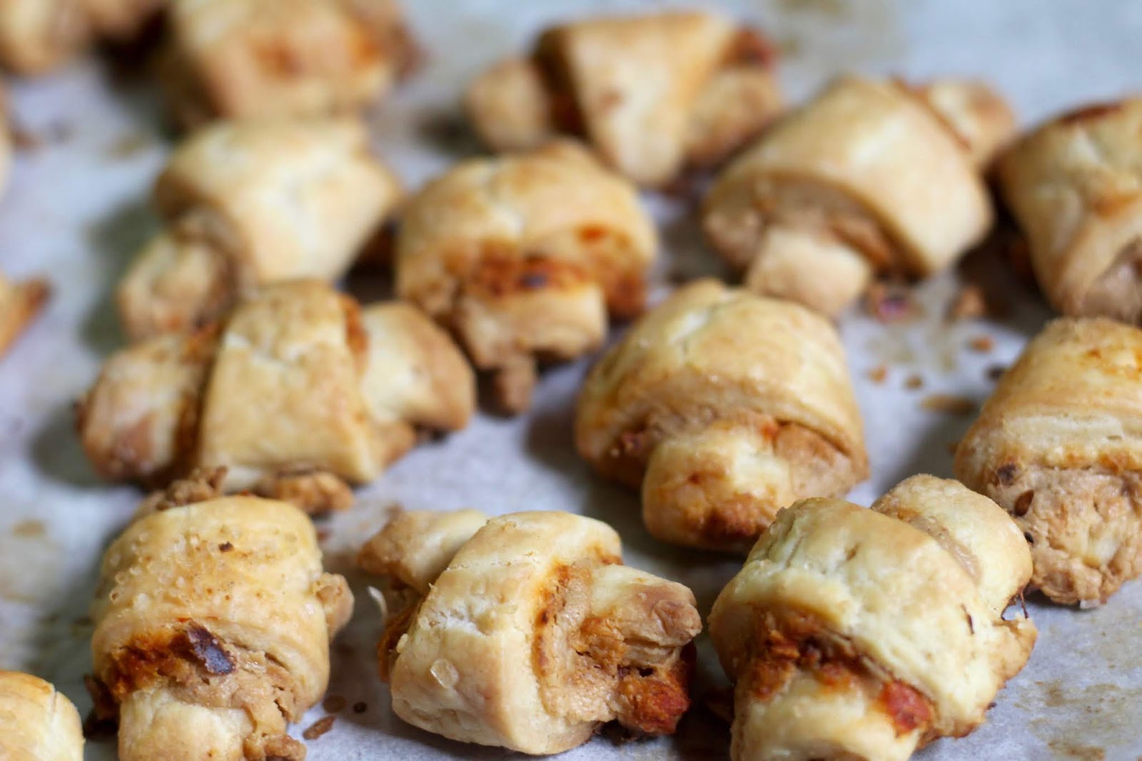To make Tahini Harissa Rugelach, follow the King Arthur Flour rugelach recipe. Swap out the filling and topping ingredients in the original recipe for the following: