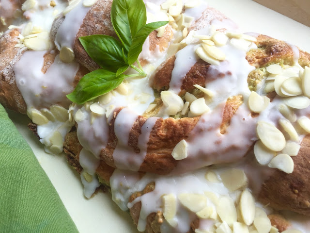 The almonds are caramelized with honey, strawberries, cream and lemon zest are then stirred in. The mixture is spread on the divided dough, rolled, up twisted and baked. It sounds way more complicated than it is.
