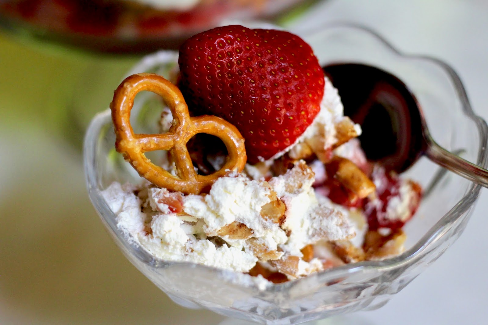 Repeat ending with the cream on top. Garnish with the reserved strawberry and pretzel pieces.