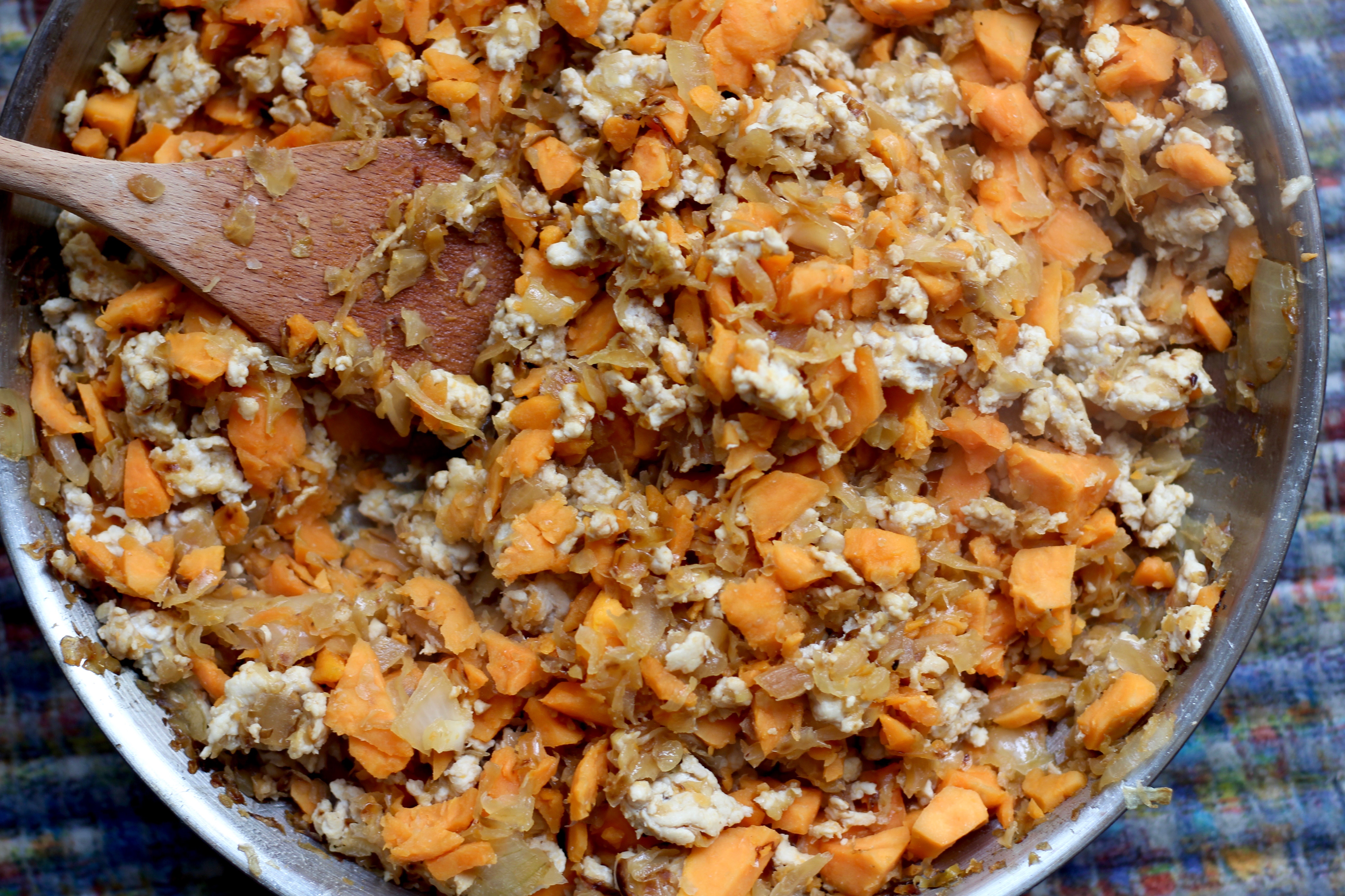Use a tablespoon to stuff the sweet potato shells with the ground turkey/sauerkraut mixture. Pour the remaining liquid from the pan over the tops of the potatoes.