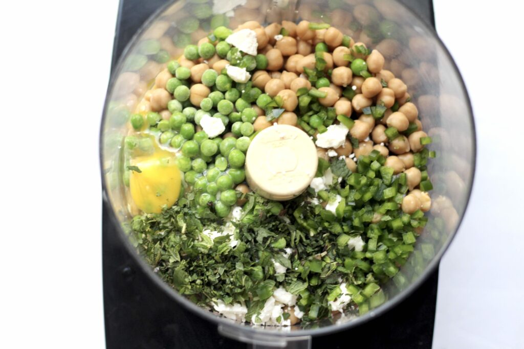 4. Purée 2 tablespoons of the mint, chickpeas, jalapeño, peas, feta, egg, and /4 cup walnuts